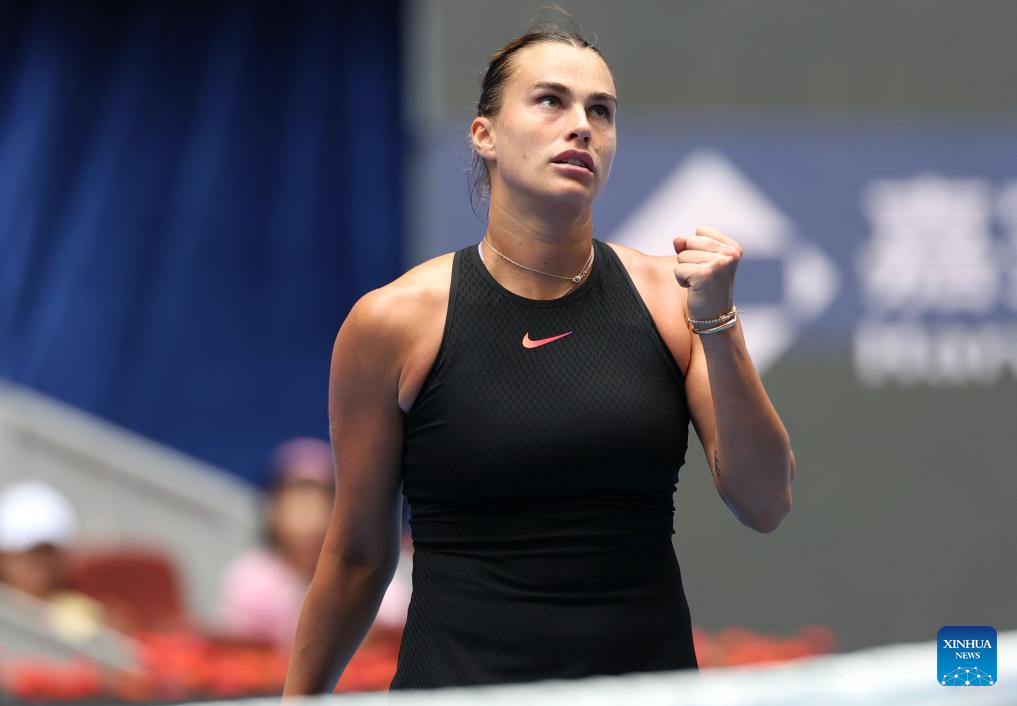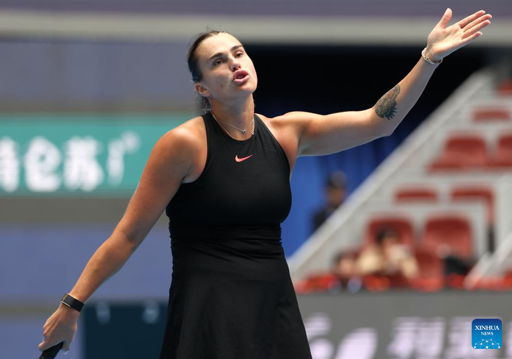 Aryna Sabalenka of Belarus reacts during the women's singles second round match between Aryna Sabalenka of Belarus and Mananchaya Sawangkaew of Thailand at 2024 China Open tennis tournament in Beijing, capital of China, Sept. 28, 2024. (Xinhua/Zhang Chenlin)