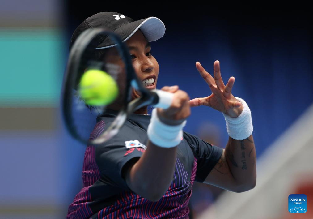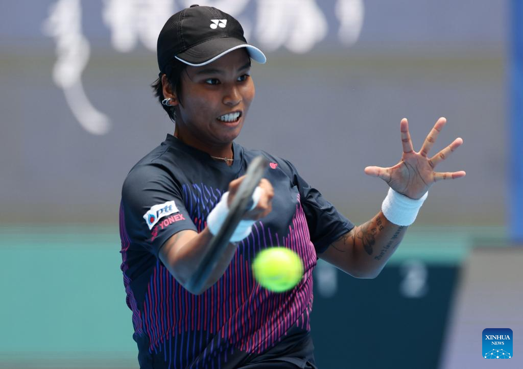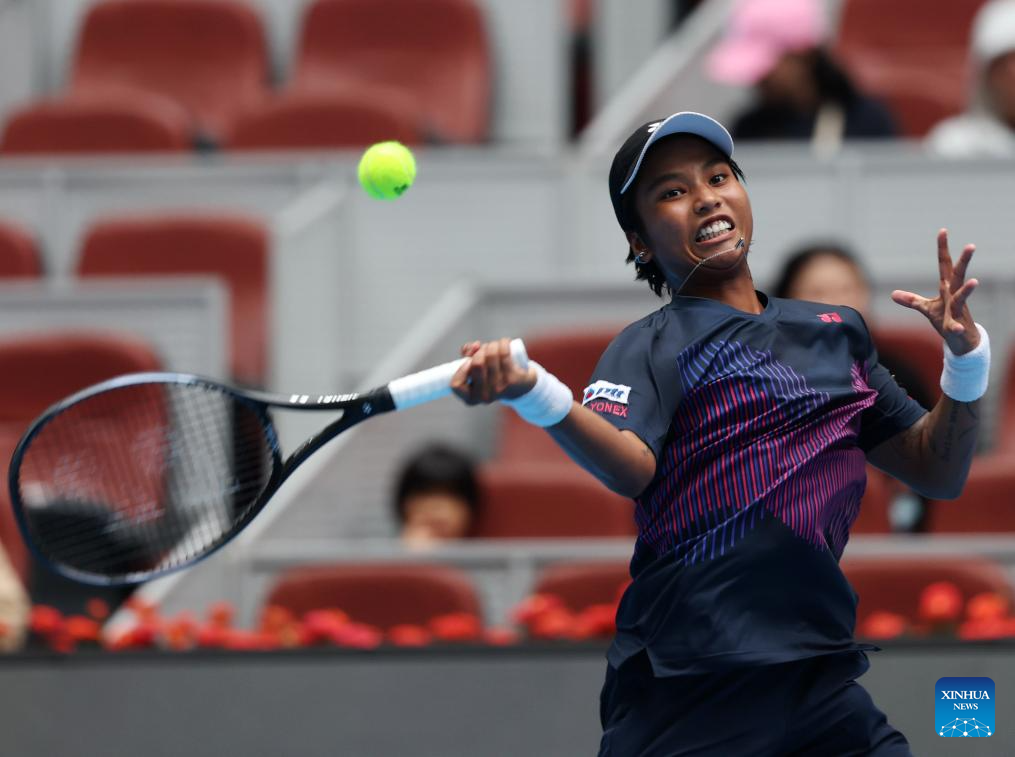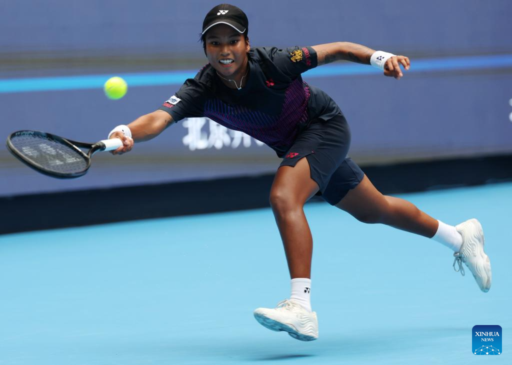 Mananchaya Sawangkaew of Thailand returns a shot during the women's singles second round match between Aryna Sabalenka of Belarus and Mananchaya Sawangkaew of Thailand at 2024 China Open tennis tournament in Beijing, capital of China, Sept. 28, 2024. (Xinhua/Zhang Chenlin)
