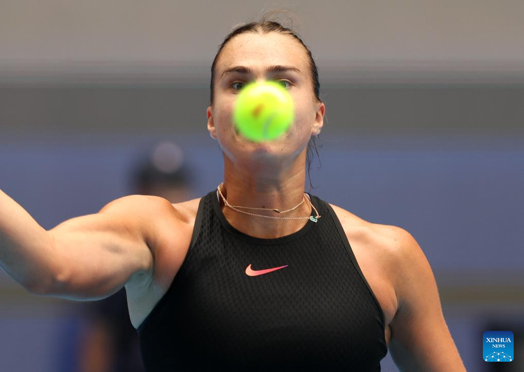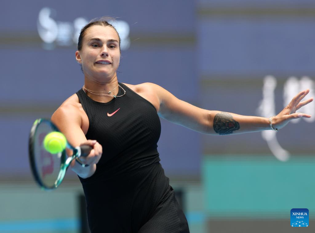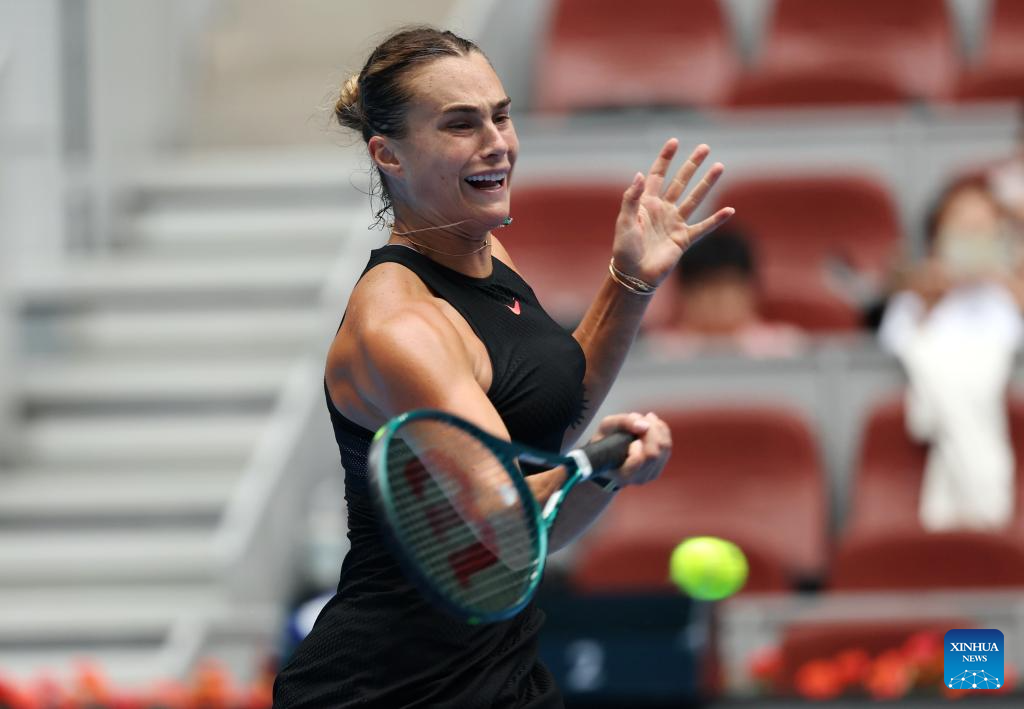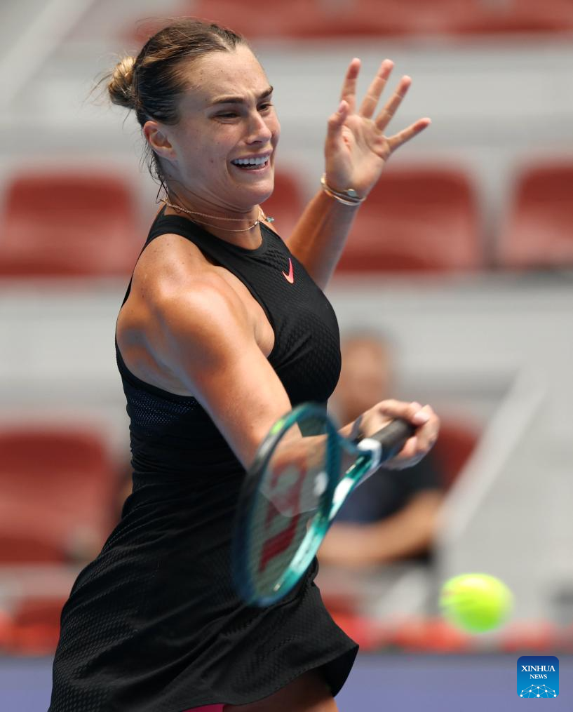 Aryna Sabalenka of Belarus returns a shot during the women's singles second round match between Aryna Sabalenka of Belarus and Mananchaya Sawangkaew of Thailand at 2024 China Open tennis tournament in Beijing, capital of China, Sept. 28, 2024. (Xinhua/Zhang Chenlin)
