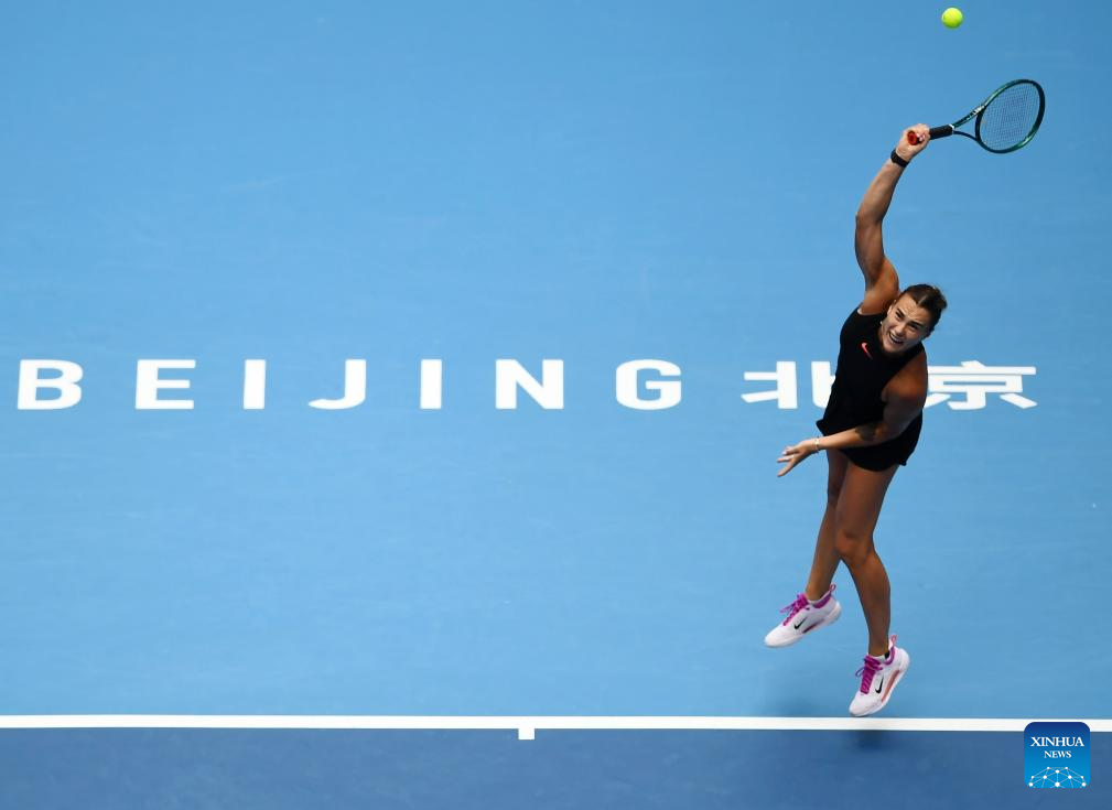 Aryna Sabalenka of Belarus serves during the women's singles second round match between Aryna Sabalenka of Belarus and Mananchaya Sawangkaew of Thailand at 2024 China Open tennis tournament in Beijing, capital of China, Sept. 28, 2024. (Xinhua/Zhang Chenlin)