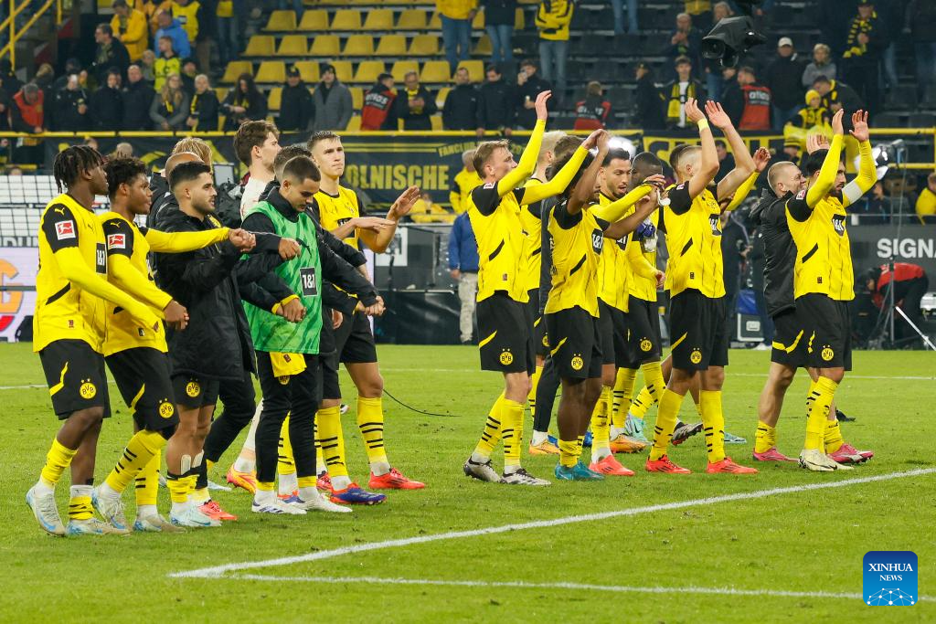 Members of Borussia Dortmund acknowledge the spectators after the first division of Bundesliga football match between Borussia Dortmund and VfL Bochum in Dortmund, Germany, Sept. 27, 2024. (Photo by Joachim Bywaletz/Xinhua)