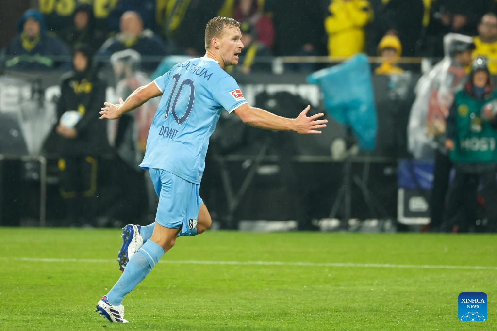 Dani de Wit of VfL Bochum celebrates scoring during the first division of Bundesliga football match between Borussia Dortmund and VfL Bochum in Dortmund, Germany, Sept. 27, 2024. (Photo by Joachim Bywaletz/Xinhua)