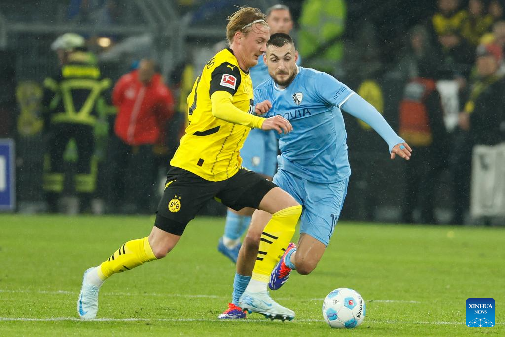 Julian Brandt (L) of Borussia Dortmund vies with Matus Bero of VfL Bochum during the first division of Bundesliga football match between Borussia Dortmund and VfL Bochum in Dortmund, Germany, Sept. 27, 2024. (Photo by Joachim Bywaletz/Xinhua)