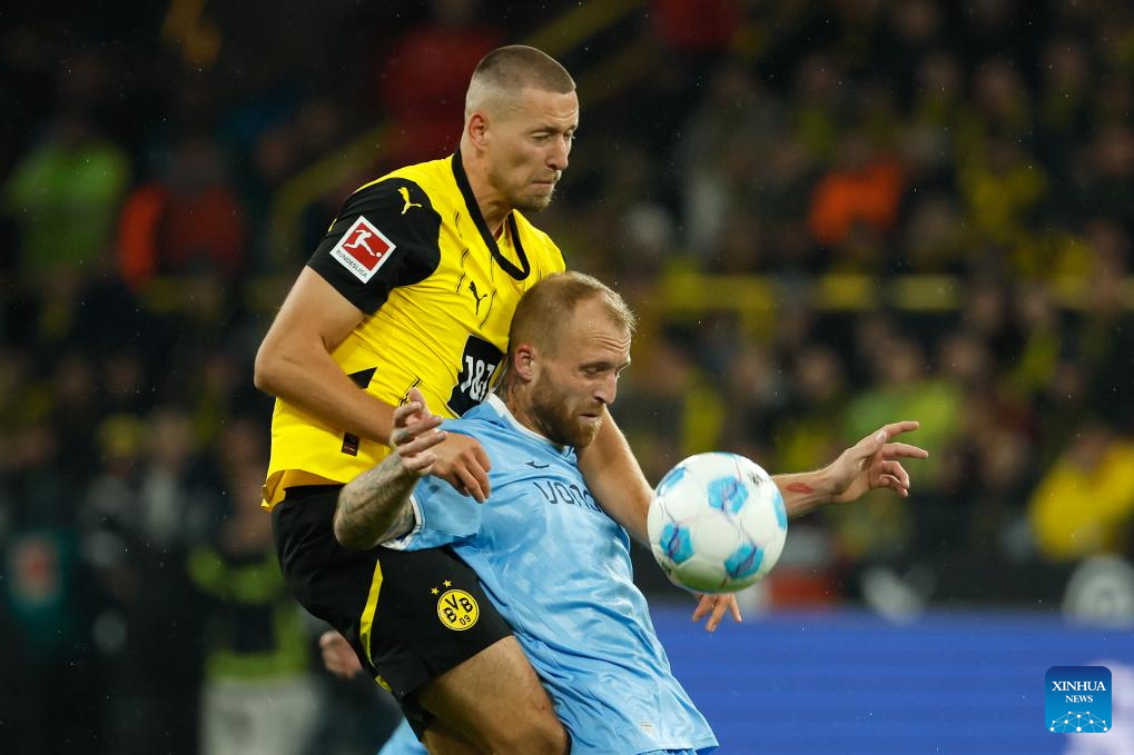 Waldemar Anton (L) of Borussia Dortmund and Philipp Hofmann of VfL Bochum head for the ball during the first division of Bundesliga football match between Borussia Dortmund and VfL Bochum in Dortmund, Germany, Sept. 27, 2024. (Photo by Joachim Bywaletz/Xinhua)