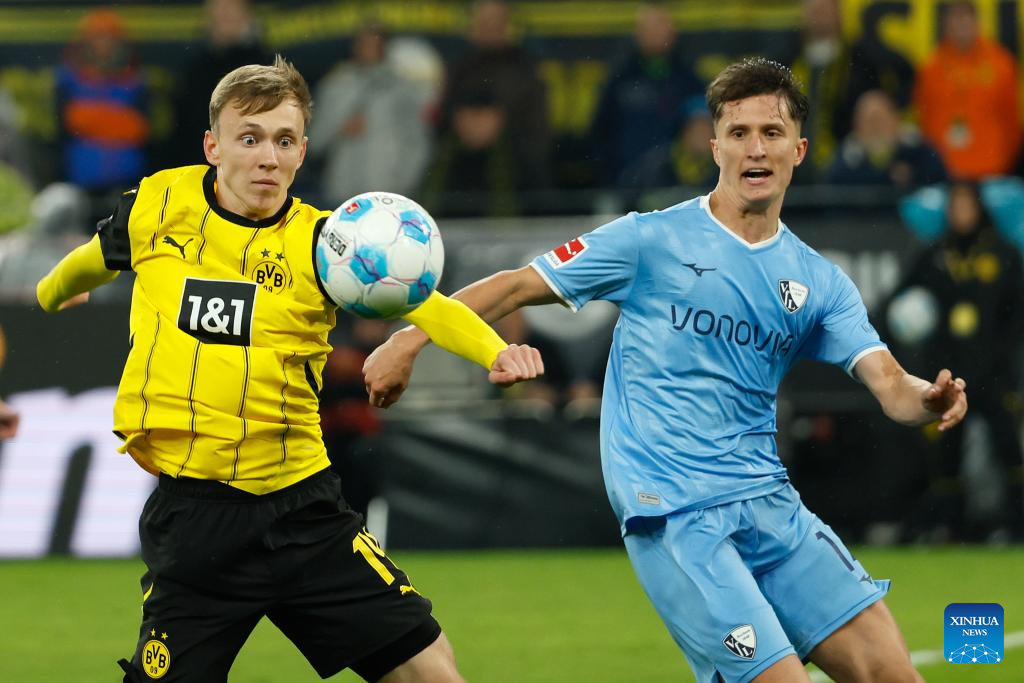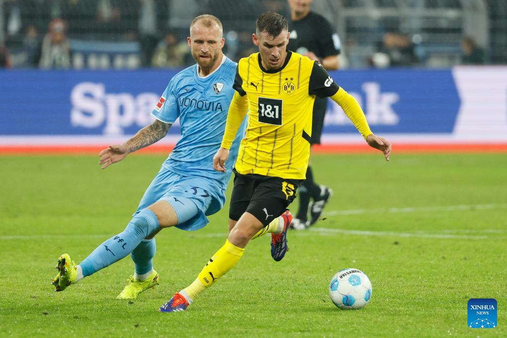 Maximilian Beier (L) of Borussia Dortmund vies with Tim Oermann of VfL Bochum during the first division of Bundesliga football match between Borussia Dortmund and VfL Bochum in Dortmund, Germany, Sept. 27, 2024. (Photo by Joachim Bywaletz/Xinhua)