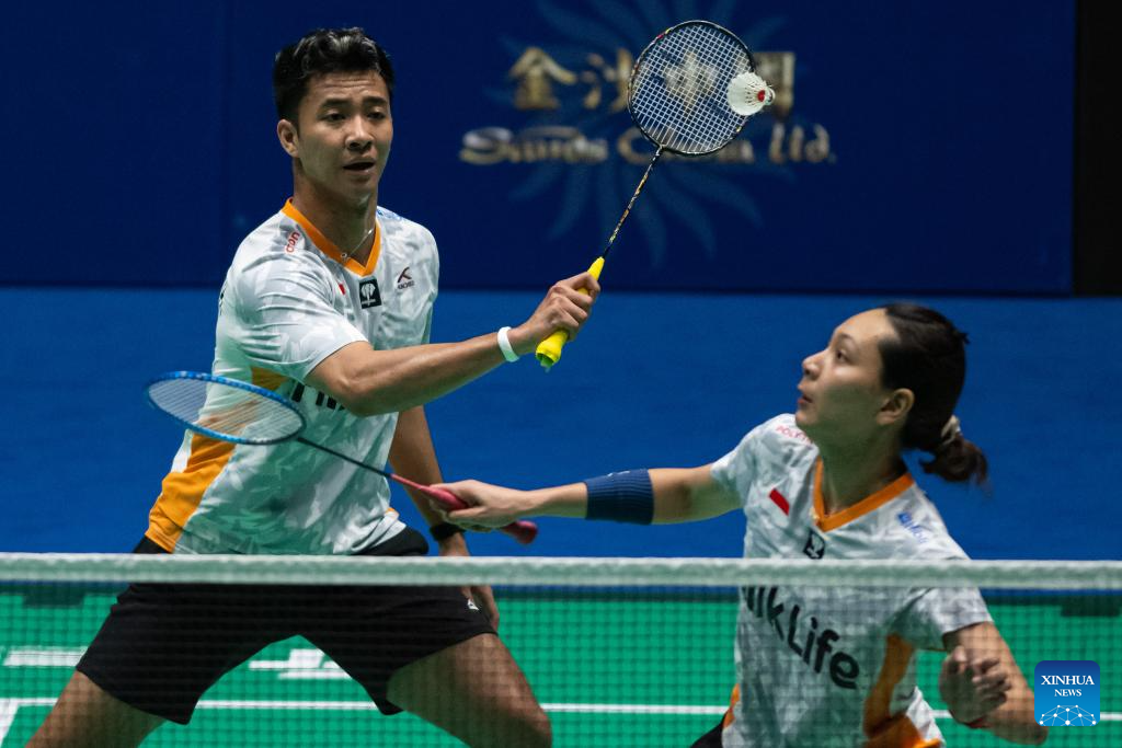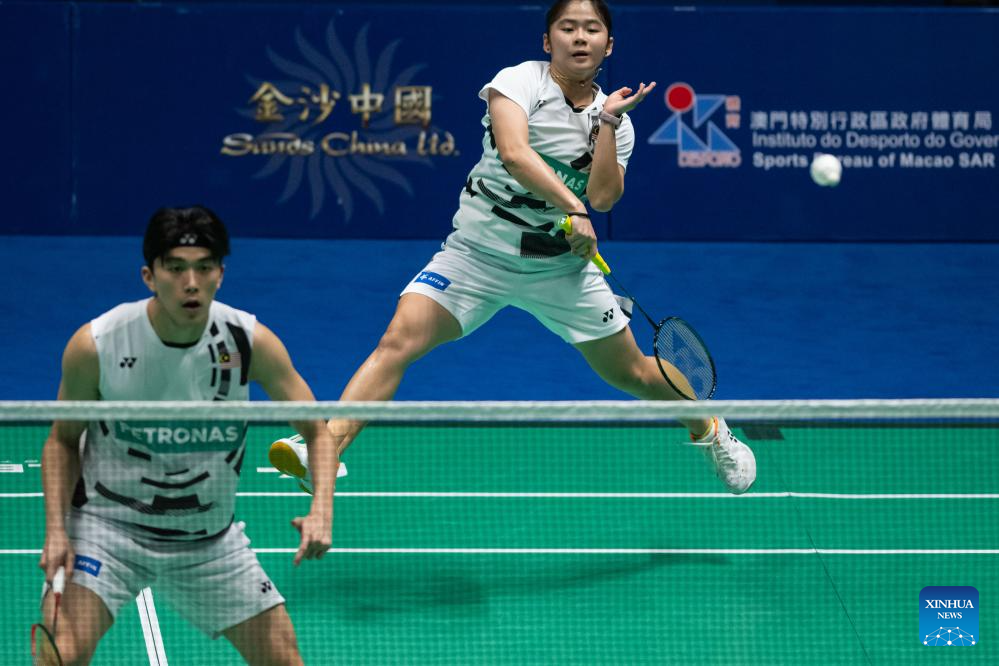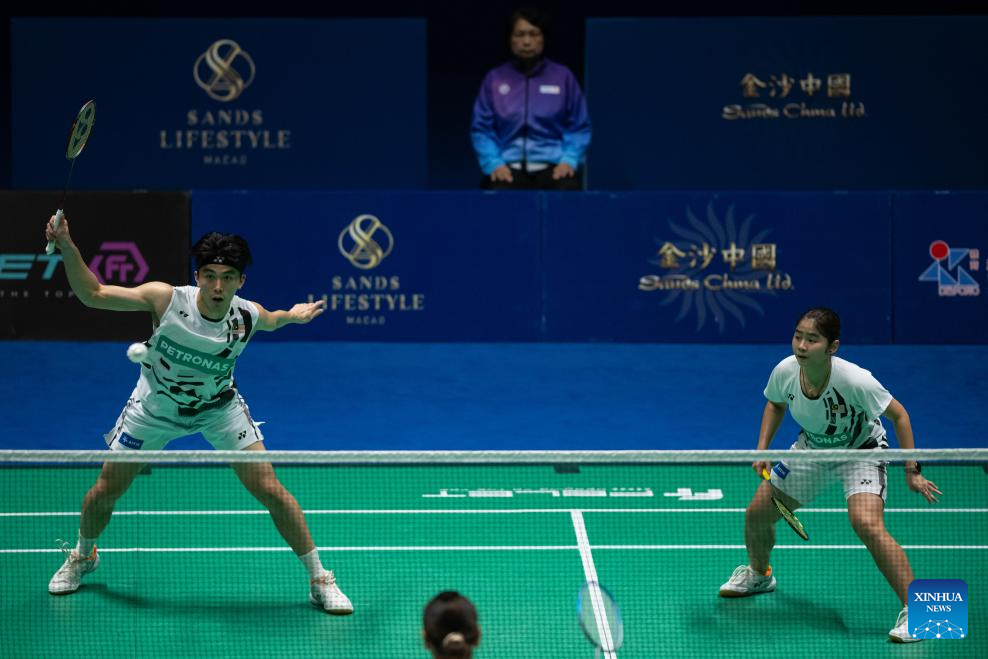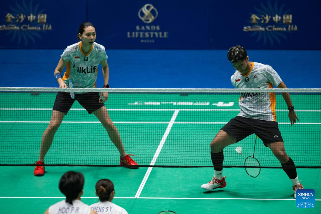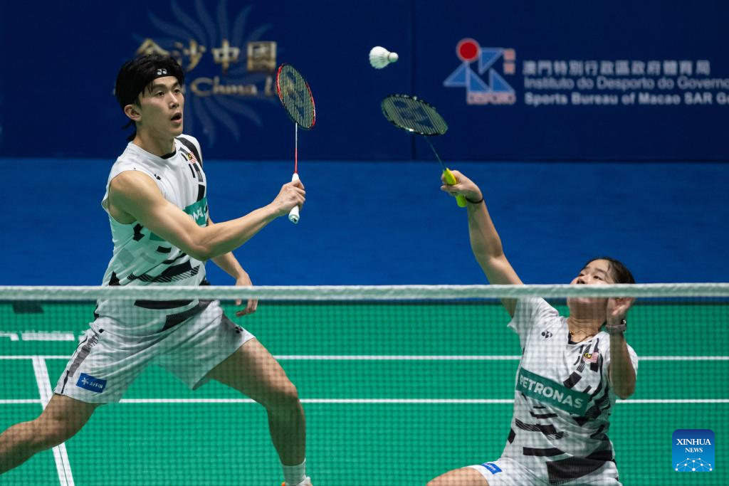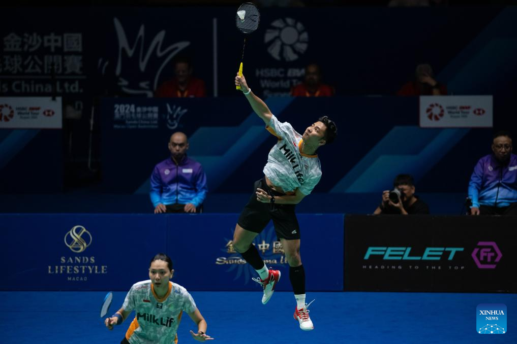 Hoo Pang Ron (L) and Cheng Su Yin compete during the mixed doubles semifinal match between Hoo Pang Ron/Cheng Su Yin of Malaysia and Dejan Ferdinansyah/Gloria Emanuelle Widjaja of Indonesia at Macao Open Badminton 2024 in Macao, south China, Sept. 28, 2024. (Xinhua/Cheong Kam Ka)