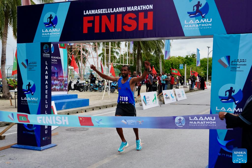 Winner of the men's half marathon event, Ahmed Ali crosses the finish line during the Laamu-Xiamen Marathon 2024 on the Laamu Atoll Link Road in Laamu Atoll, Maldives, Sept. 27, 2024. The Laamu Atoll Link Road project was aided by the Chinese government. (Xinhua/Wu Yue)