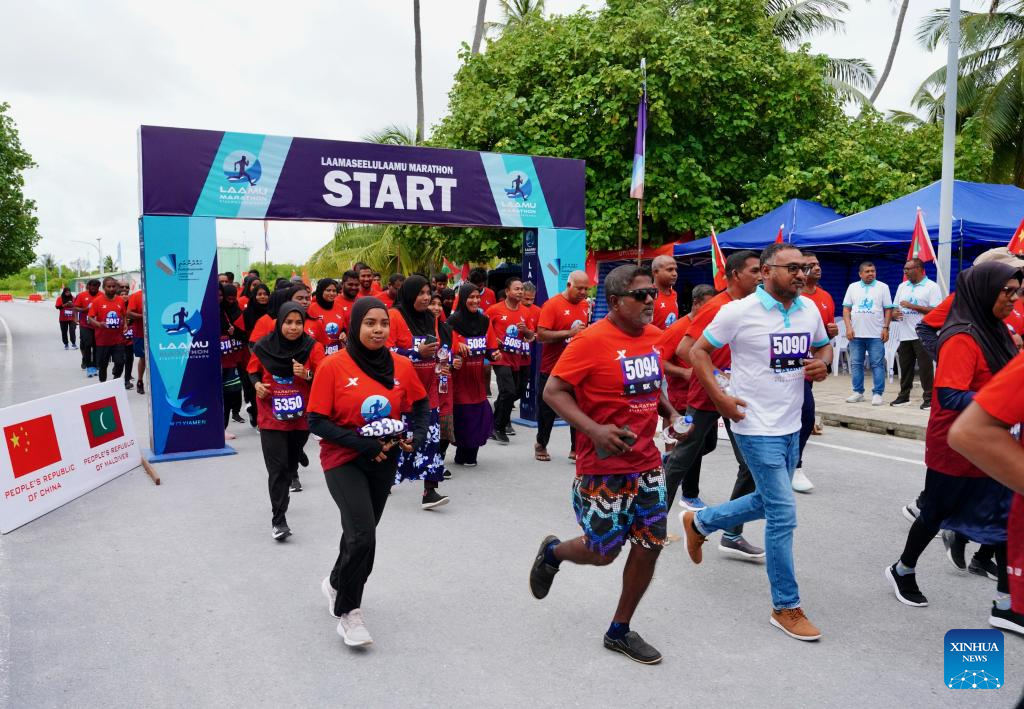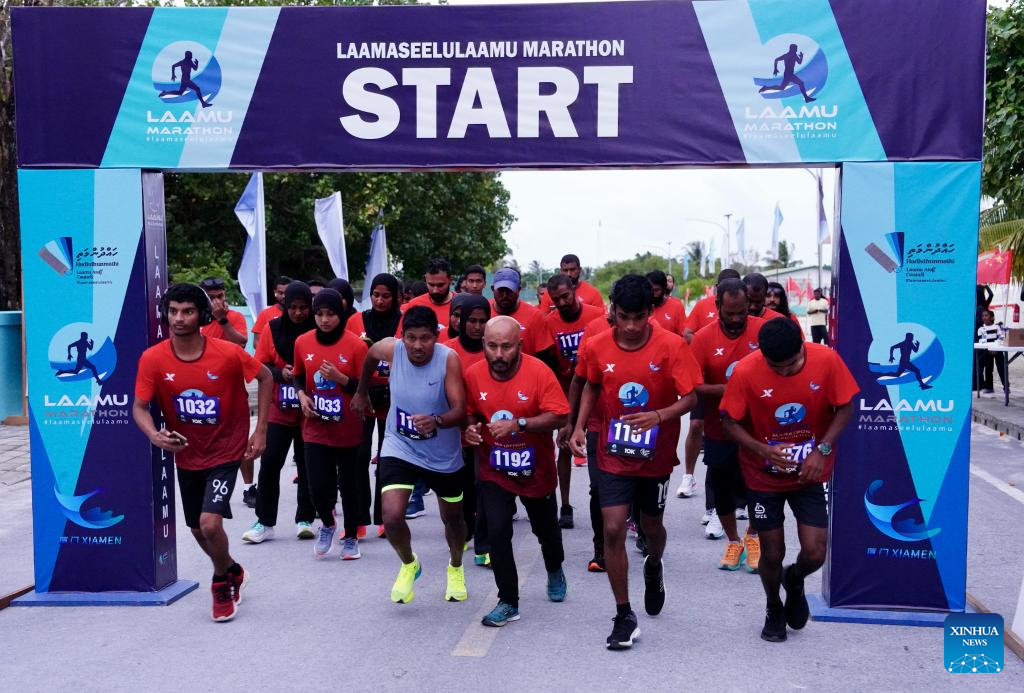 Athletes compete during the Laamu-Xiamen Marathon 2024 on the Laamu Atoll Link Road in Laamu Atoll, Maldives, Sept. 27, 2024. The Laamu Atoll Link Road project was aided by the Chinese government. (Xinhua/Wu Yue)
