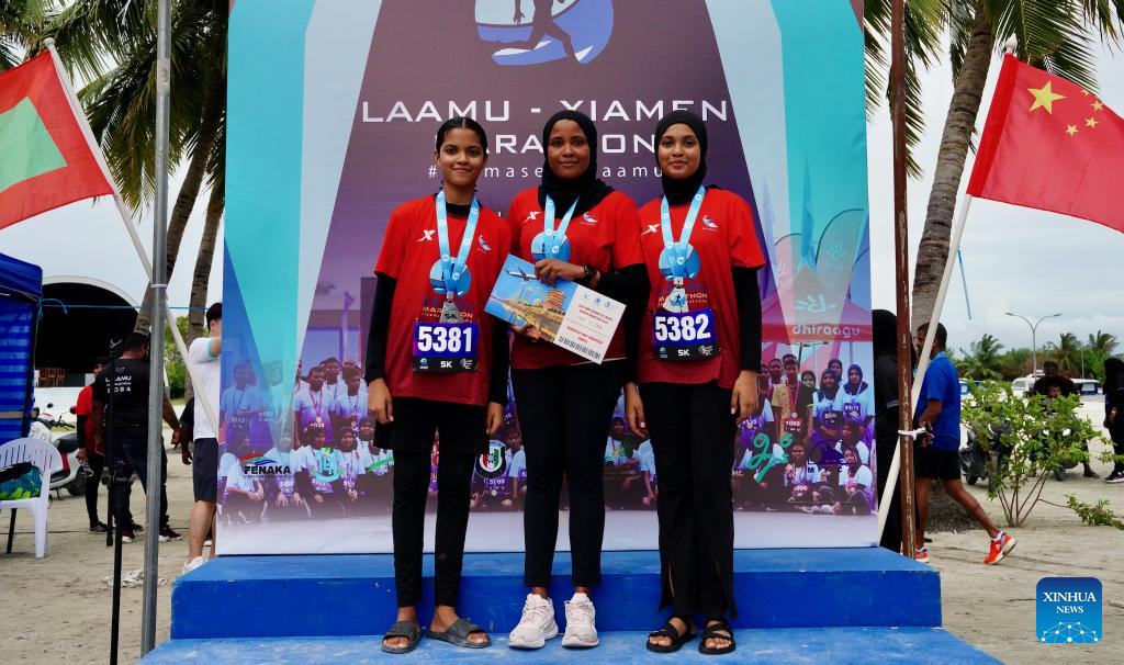 Winner of the women's half marathon event, Mariyam Shizaana (C) of Maldives poses for photos with her daughters after the awarding ceremony at the Laamu-Xiamen Marathon 2024 on the Laamu Atoll Link Road in Laamu Atoll, Maldives, Sept. 27, 2024. The Laamu Atoll Link Road project was aided by the Chinese government. (Xinhua/Wu Yue)