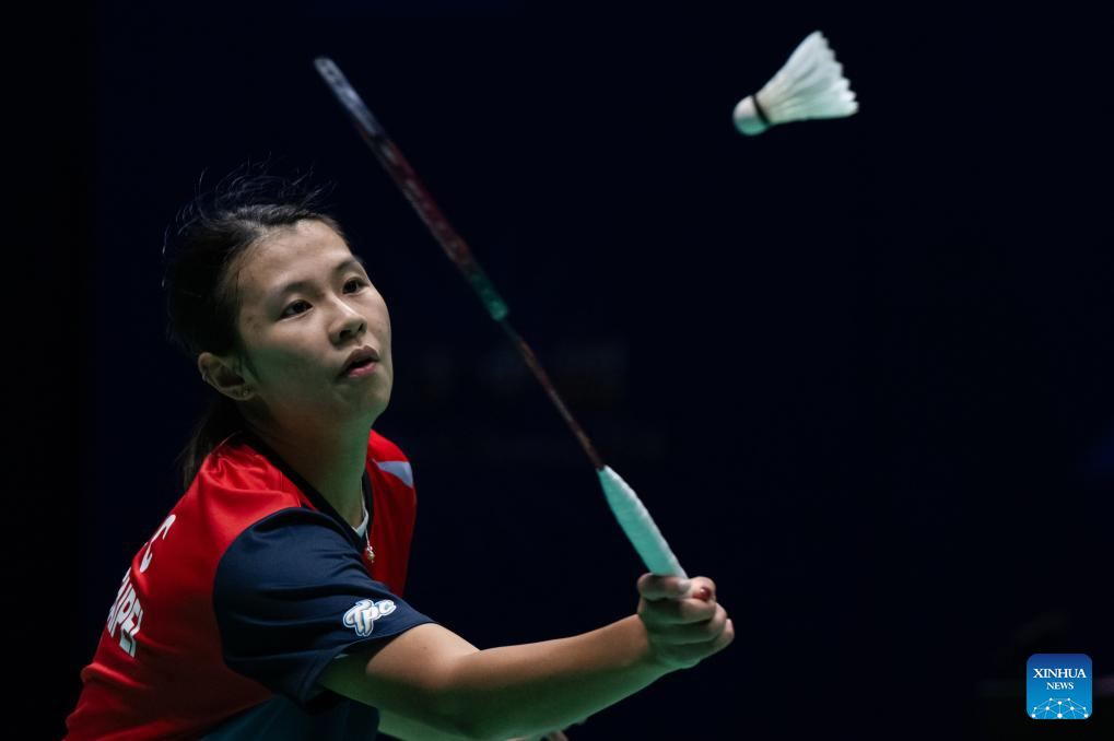 Chiu Pin-Chian hits a return during the women's singles semifinal match between Gao Fangjie of China and Chiu Pin-Chian of Chinese Taipei at Macao Open Badminton 2024 in Macao, south China, Sept. 28, 2024. (Xinhua/Cheong Kam Ka)