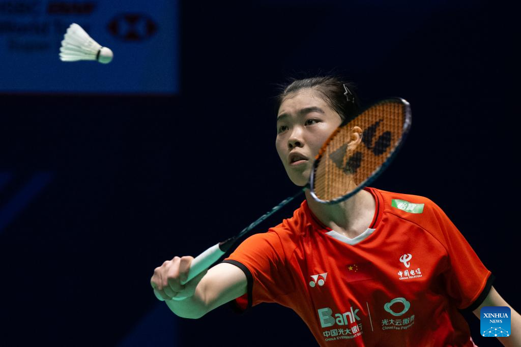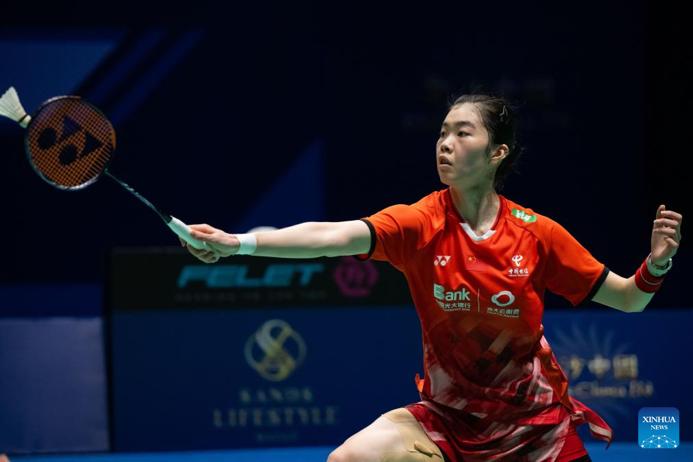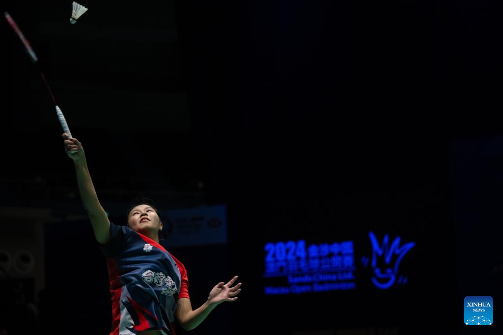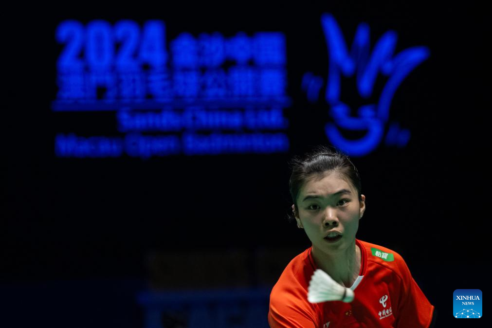 Gao Fangjie hits a return during the women's singles semifinal match between Gao Fangjie of China and Chiu Pin-Chian of Chinese Taipei at Macao Open Badminton 2024 in Macao, south China, Sept. 28, 2024. (Xinhua/Cheong Kam Ka)