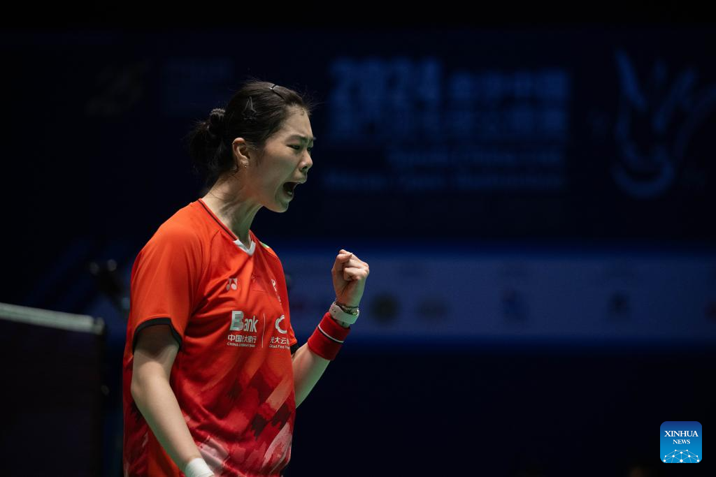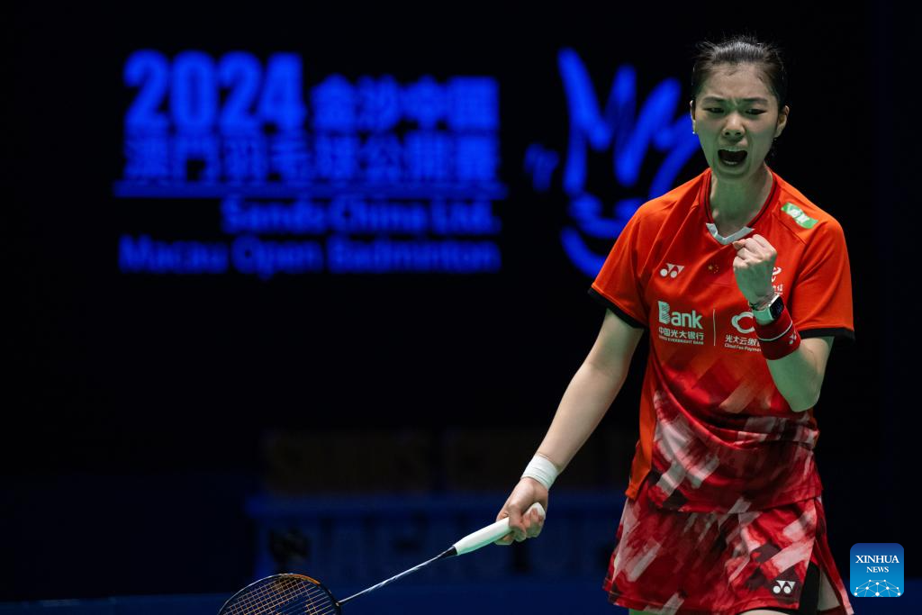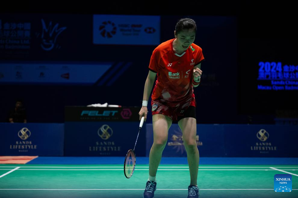 Gao Fangjie celebrates scoring during the women's singles semifinal match between Gao Fangjie of China and Chiu Pin-Chian of Chinese Taipei at Macao Open Badminton 2024 in Macao, south China, Sept. 28, 2024. (Xinhua/Cheong Kam Ka)