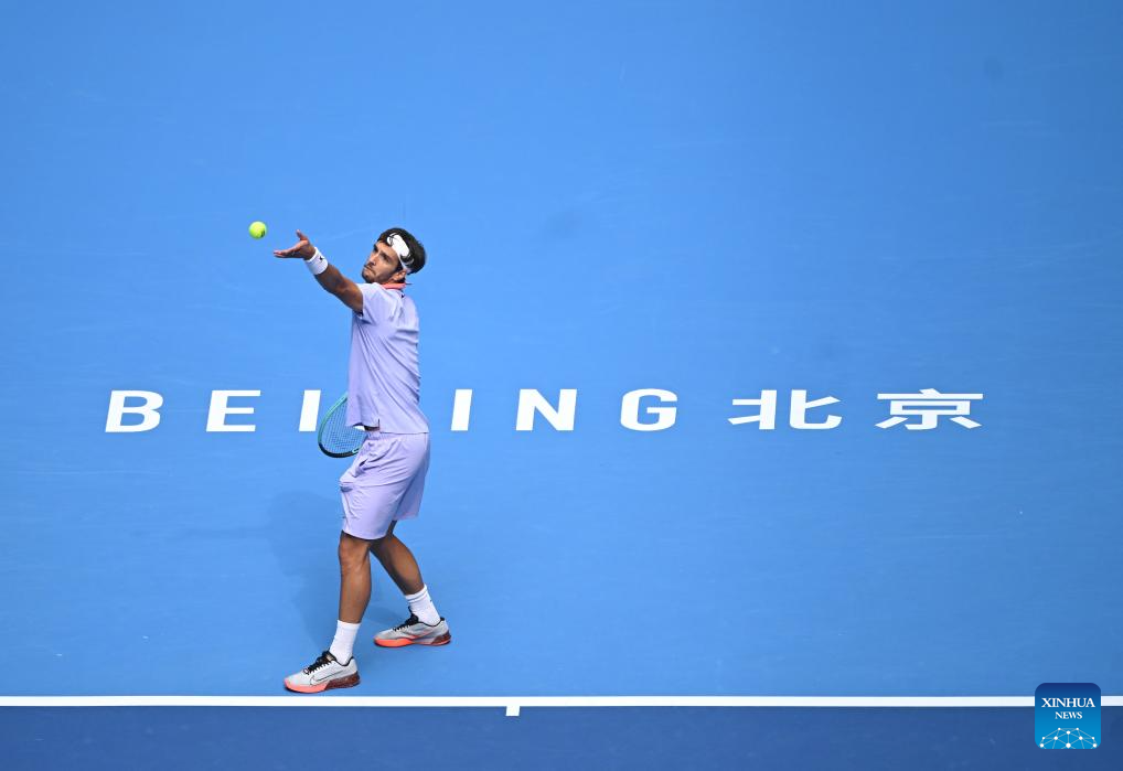Lorenzo Musetti serves during the men's singles second round match between Bu Yunchaokete of China and Lorenzo Musetti of Italy at 2024 China Open tennis tournament in Beijing, capital of China, Sept. 29, 2024. (Xinhua/Zhang Long)