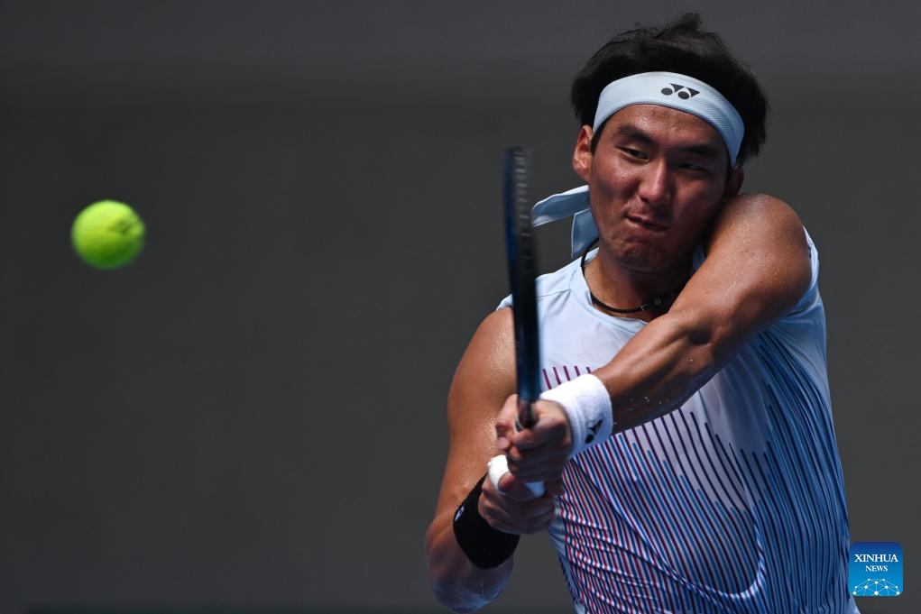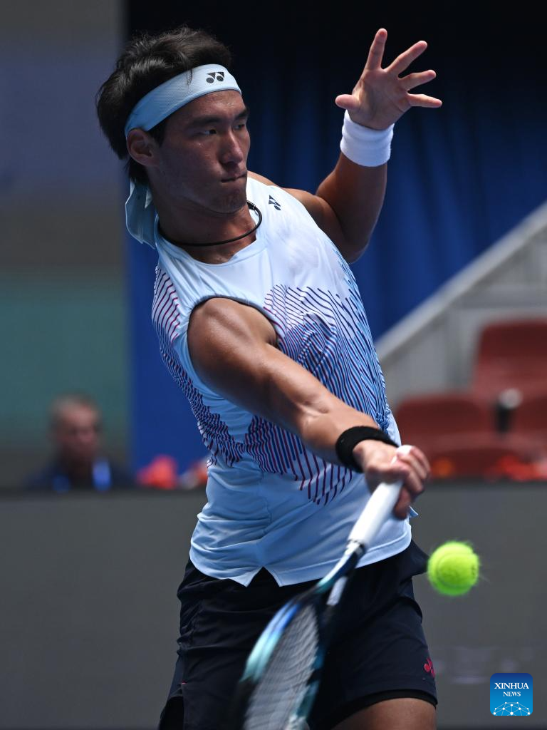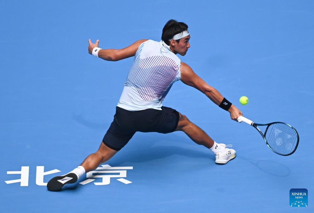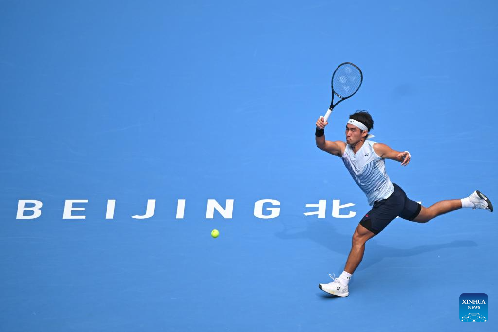 Bu Yunchaokete hits a return during the men's singles second round match between Bu Yunchaokete of China and Lorenzo Musetti of Italy at 2024 China Open tennis tournament in Beijing, capital of China, Sept. 29, 2024. (Xinhua/Zhang Long)