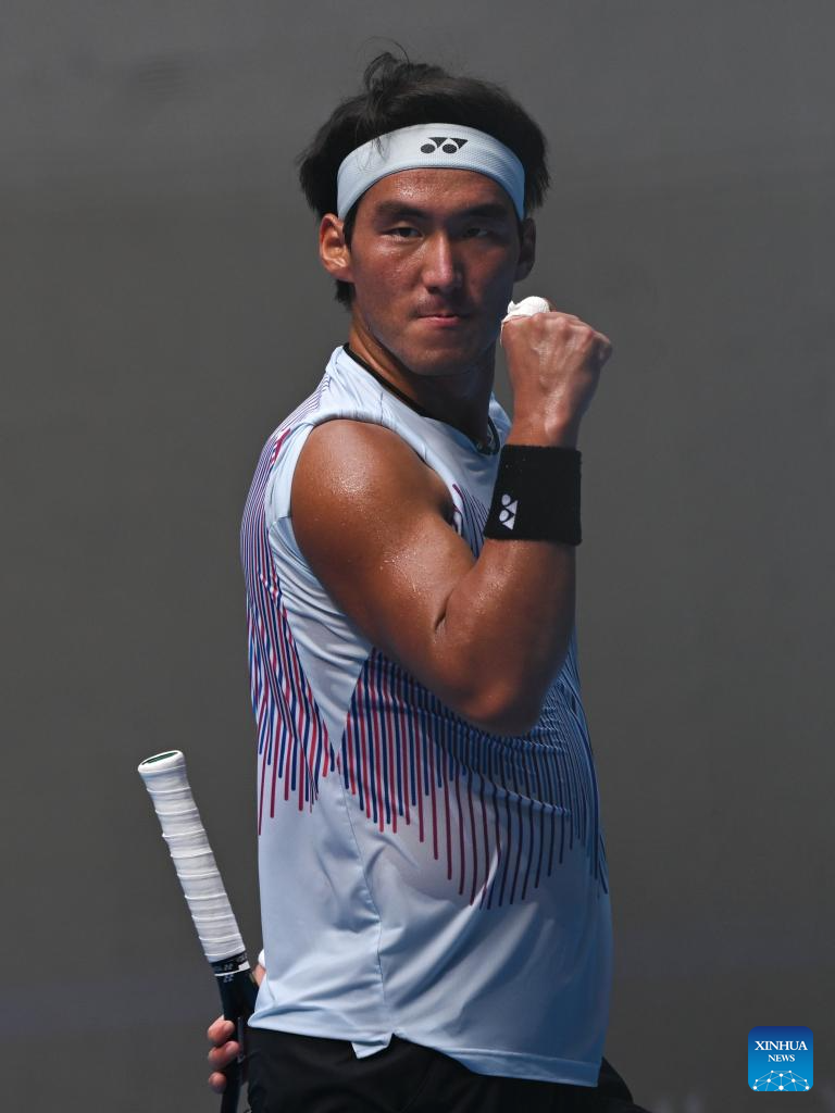 Bu Yunchaokete celebrates scoring during the men's singles second round match between Bu Yunchaokete of China and Lorenzo Musetti of Italy at 2024 China Open tennis tournament in Beijing, capital of China, Sept. 29, 2024. (Xinhua/Zhang Long)