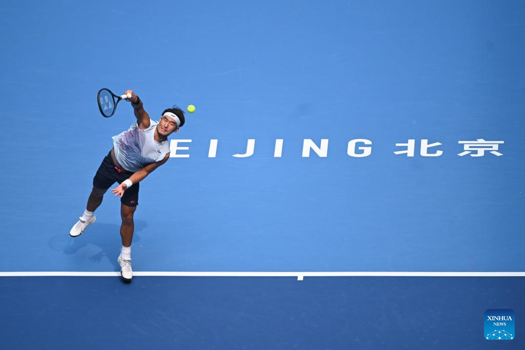 Bu Yunchaokete serves during the men's singles second round match between Bu Yunchaokete of China and Lorenzo Musetti of Italy at 2024 China Open tennis tournament in Beijing, capital of China, Sept. 29, 2024. (Xinhua/Zhang Long)