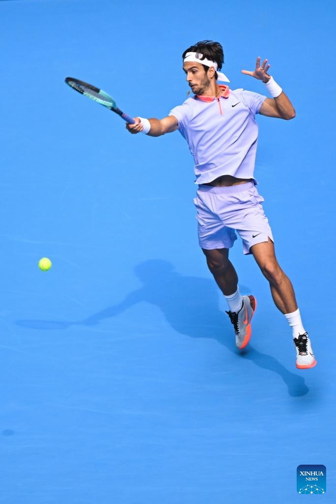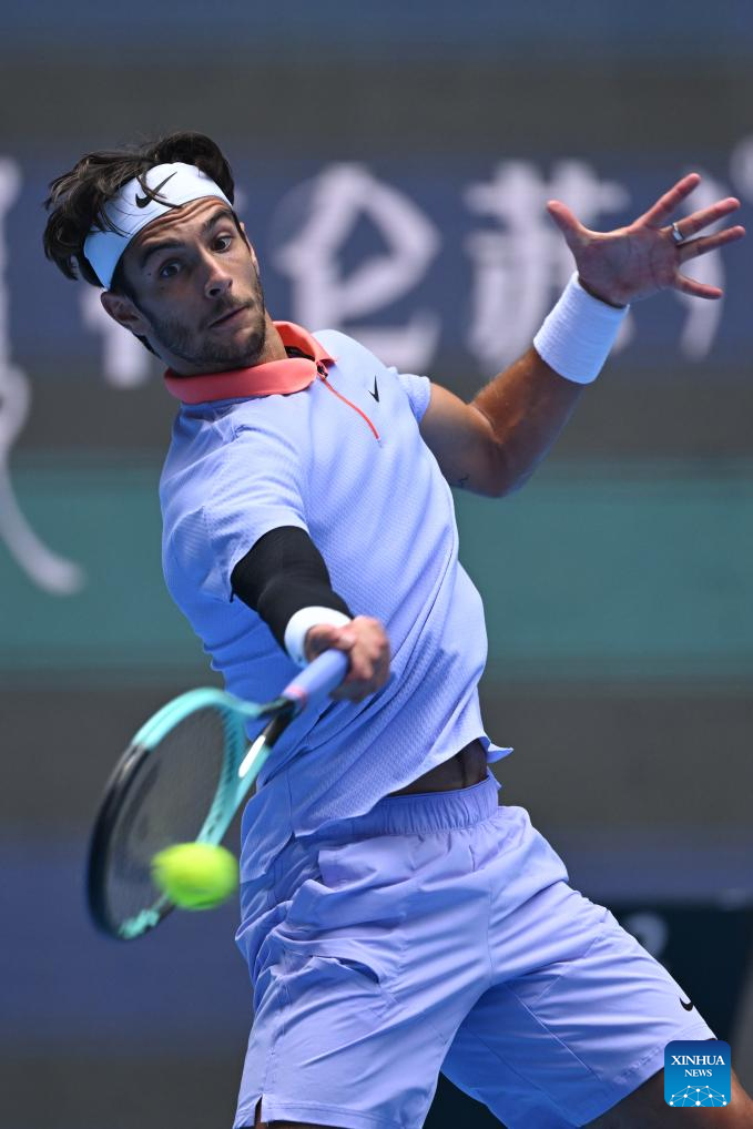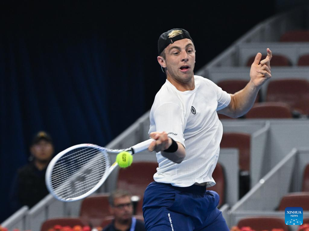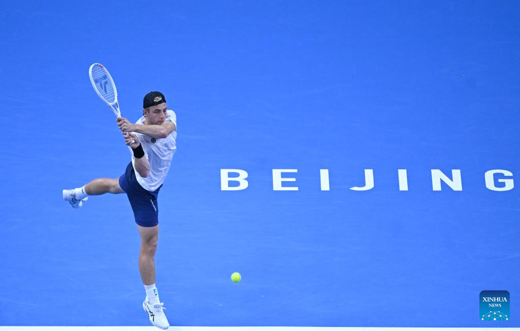 Tallon Griekspoor hits a return during the men's singles second round match between Carlos Alcaraz of Spain and Tallon Griekspoor of the Netherlands at 2024 China Open tennis tournament in Beijing, capital of China, Sept. 29, 2024. (Xinhua/Zhang Long)