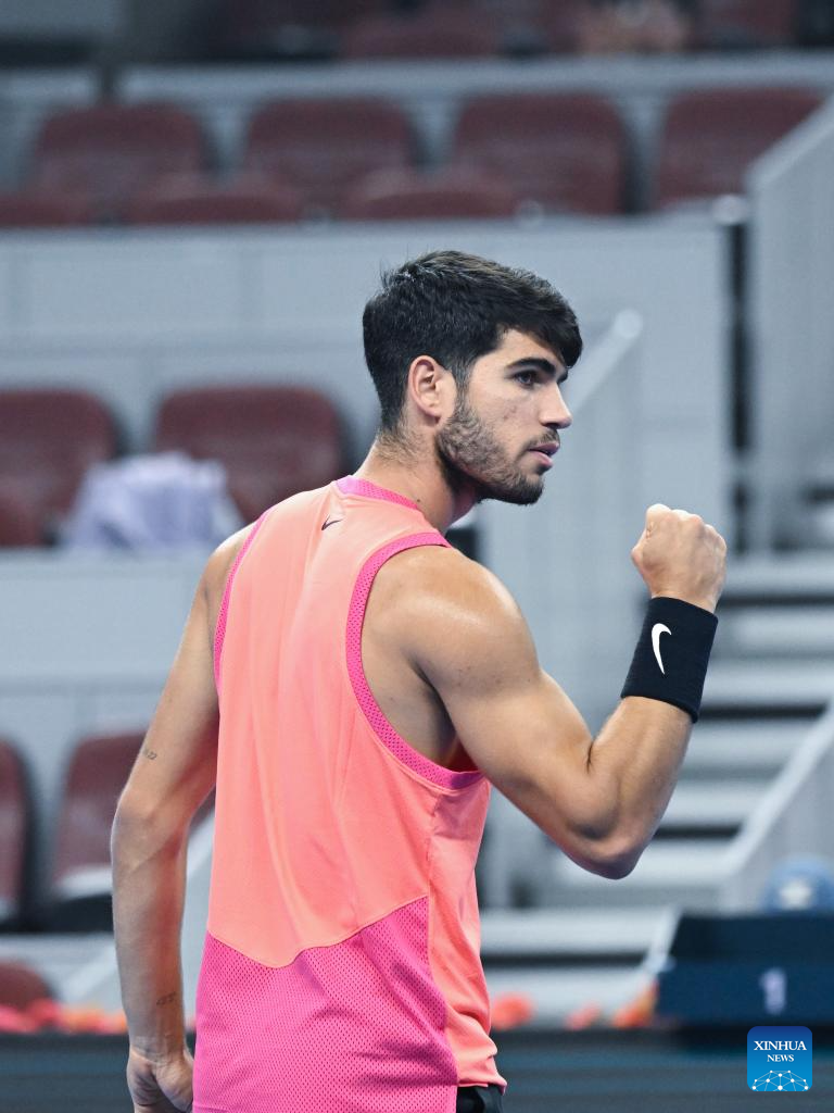 Carlos Alcaraz celebrates scoring during the men's singles second round match between Carlos Alcaraz of Spain and Tallon Griekspoor of the Netherlands at 2024 China Open tennis tournament in Beijing, capital of China, Sept. 29, 2024. (Xinhua/Zhang Long)