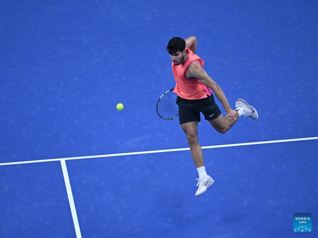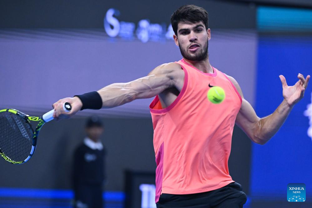 Carlos Alcaraz hits a return during the men's singles second round match between Carlos Alcaraz of Spain and Tallon Griekspoor of the Netherlands at 2024 China Open tennis tournament in Beijing, capital of China, Sept. 29, 2024. (Xinhua/Zhang Long)
