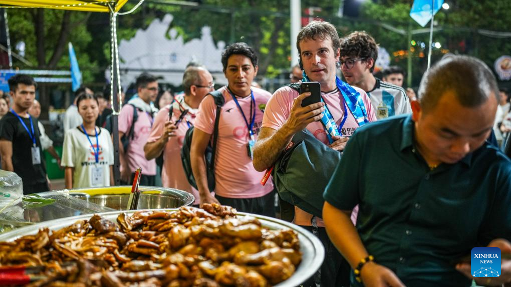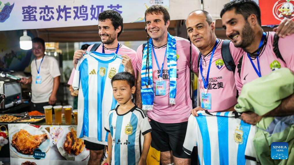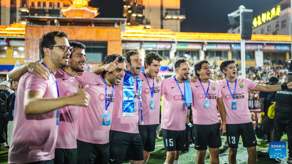 Diplomats from Argentina are seen during a friendly football match event between foreign diplomats team and a local amateur team in Rongjiang County of southwest China's Guizhou Province, Sept. 28, 2024. A total of 24 diplomats stationed in China visited Guizhou Province from Friday to Sunday, during which time they enjoyed traditional ethnic songs, visited a local craftsmanship workshop and attended a friendly football match with a local amateur team in Rongjiang County. (Xinhua/Tao Liang)