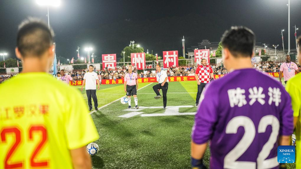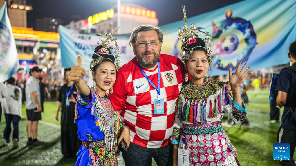 Croatian Ambassador to China Dario Mihelin (C) is seen during a friendly football match event between foreign diplomats team and a local amateur team in Rongjiang County of southwest China's Guizhou Province, Sept. 28, 2024. A total of 24 diplomats stationed in China visited Guizhou Province from Friday to Sunday, during which time they enjoyed traditional ethnic songs, visited a local craftsmanship workshop and attended a friendly football match with a local amateur team in Rongjiang County. (Xinhua/Tao Liang)