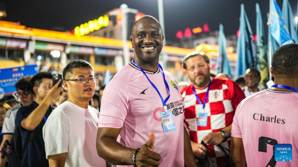 A diplomat gives a thumbs-up during a friendly football match event between foreign diplomats team and a local amateur team in Rongjiang County of southwest China's Guizhou Province, Sept. 28, 2024. A total of 24 diplomats stationed in China visited Guizhou Province from Friday to Sunday, during which time they enjoyed traditional ethnic songs, visited a local craftsmanship workshop and attended a friendly football match with a local amateur team in Rongjiang County. (Xinhua/Tao Liang)