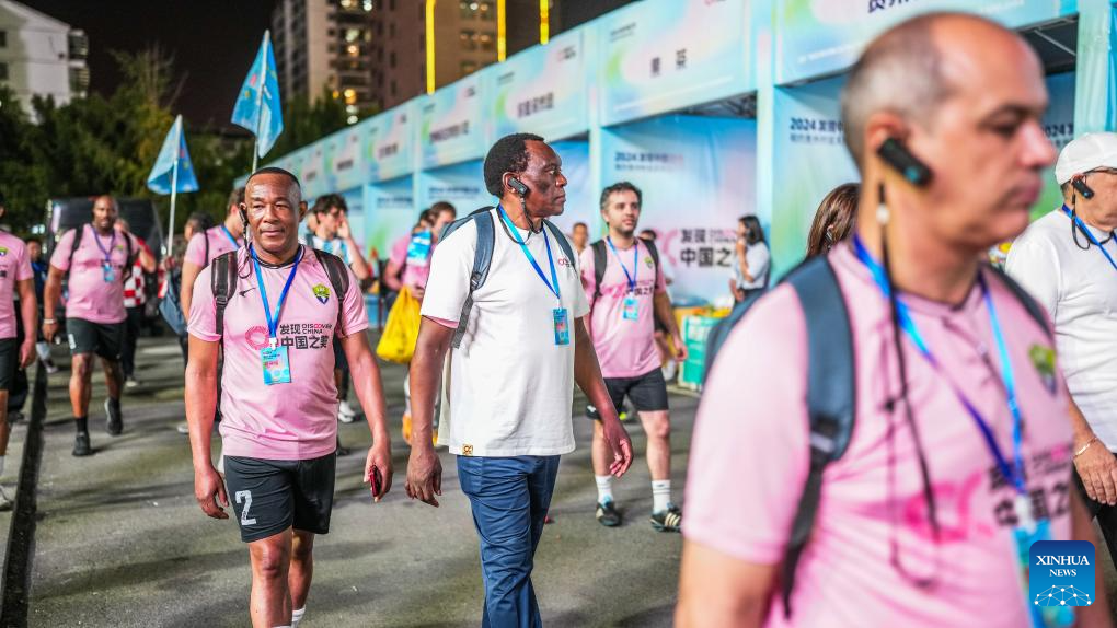 Members of foreign diplomats team are seen during a friendly football match event between foreign diplomats team and a local amateur team in Rongjiang County of southwest China's Guizhou Province, Sept. 28, 2024. A total of 24 diplomats stationed in China visited Guizhou Province from Friday to Sunday, during which time they enjoyed traditional ethnic songs, visited a local craftsmanship workshop and attended a friendly football match with a local amateur team in Rongjiang County. (Xinhua/Tao Liang)