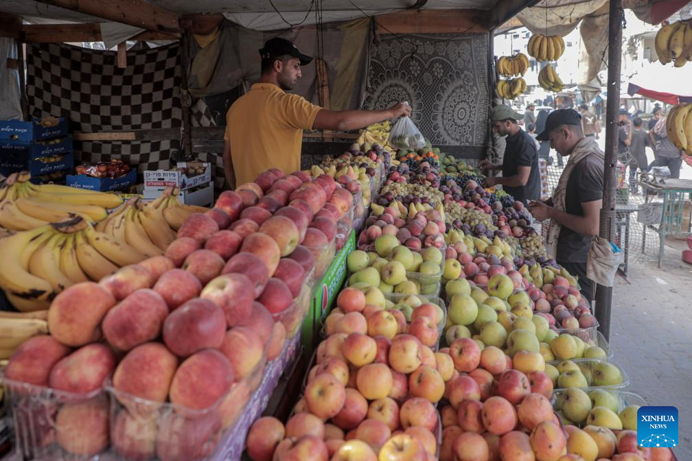 A Palestinian vendor sells fruit at a market in the southern Gaza Strip city of Khan Younis, on Sept. 30, 2024. (Photo by Rizek Abdeljawad/Xinhua)