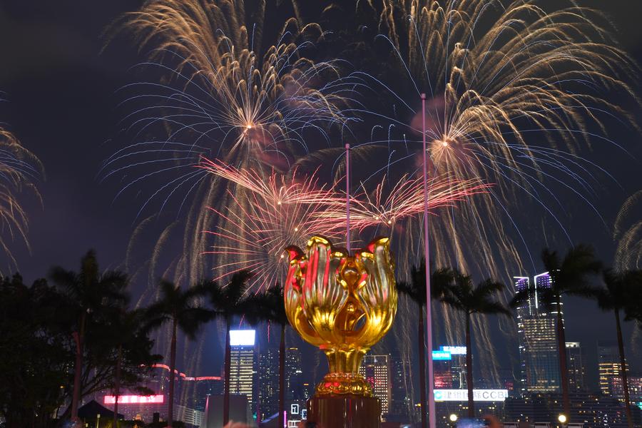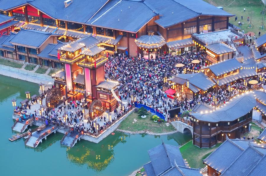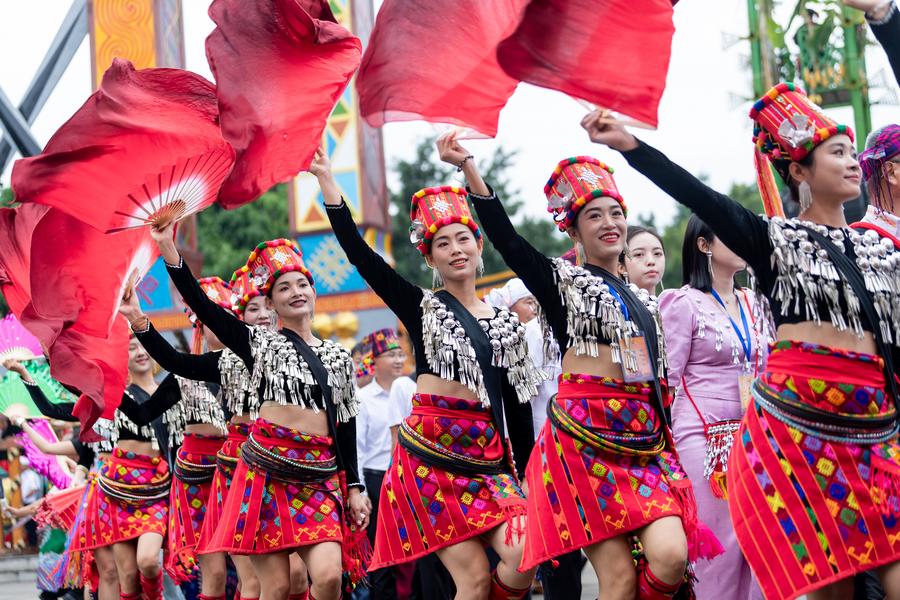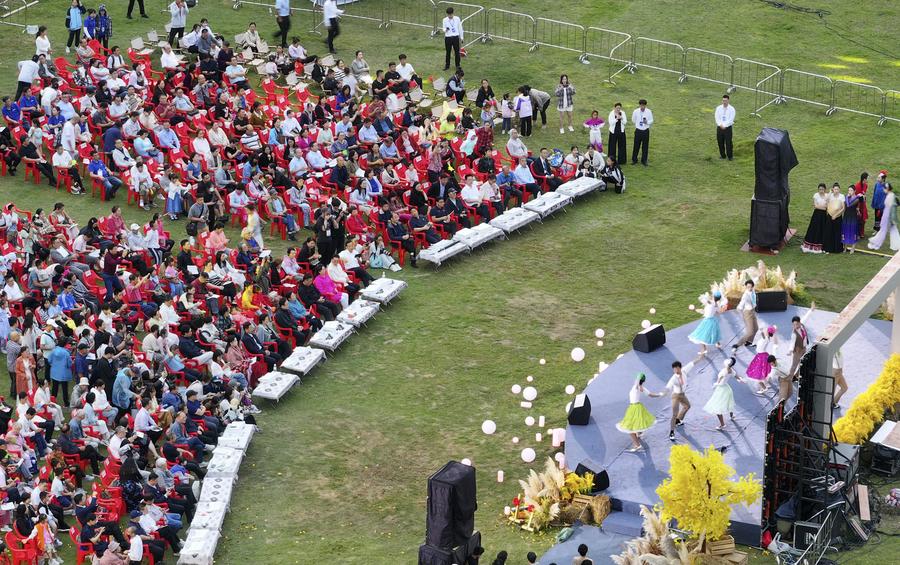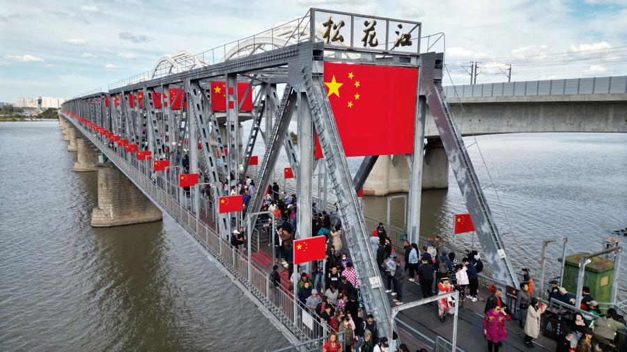 A child holding a Chinese national flag enjoys herself at a wetland park in Xigang Town, Tengzhou City of east China's Shandong Province, Oct. 1, 2024. (Photo by Li Zhijun/Xinhua)Girls in traditional ethnic attire perform during a gala event in Longchuan County of Dehong Dai and Jingpo Autonomous Prefecture, southwest China's Yunnan Province, Oct. 2, 2024. (Photo by Gui Jinzai/Xinhua)Fireworks celebrating the 75th anniversary of the founding of the People's Republic of China illuminate the sky over Victoria Harbour in Hong Kong, south China, Oct. 1, 2024. (Xinhua/Chen Duo)People have fun in a pedestrian zone used to be a railway bridge in Harbin, northeast China's Heilongjiang Province, Oct. 1, 2024. (Photo by Liu Yang/Xinhua)People have fun at a folk arts and food compound in Nanyue District of Hengyang, central China's Hunan Province, Oct. 1, 2024. (Photo by Cao Zhengping/Xinhua)An aerial drone photo shows visitors watching an open-air concert in Shuangqiao Town, Wuming District of Nanning City, south China's Guangxi Zhuang Autonomous Region, Oct. 1, 2024. (Photo by Yu Xiangquan/Xinhua)A tourist takes selfies among flowers at a scenic spot in Qushi Town, Tengchong City of southwest China's Yunnan Province, Oct. 2, 2024. (Photo by Gong Zujin/Xinhua)An aerial drone photo taken on Oct. 2, 2024 shows tourists visiting the Shenxianju scenery spot in Taizhou, east China's Zhejiang Province. (Photo by Wang Huabin/Xinhua)■