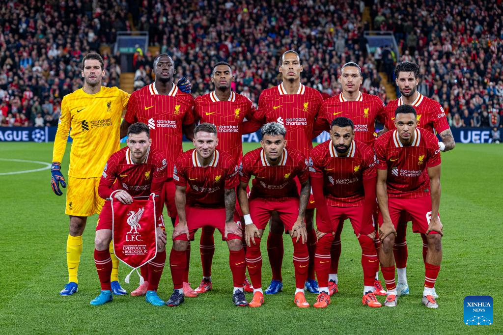 Liverpool's starters line up for a team group photograph before the second round match of UEFA Champions League between Liverpool FC and Bologna FC in Liverpool, Britain, Oct. 2, 2024. (Xinhua)