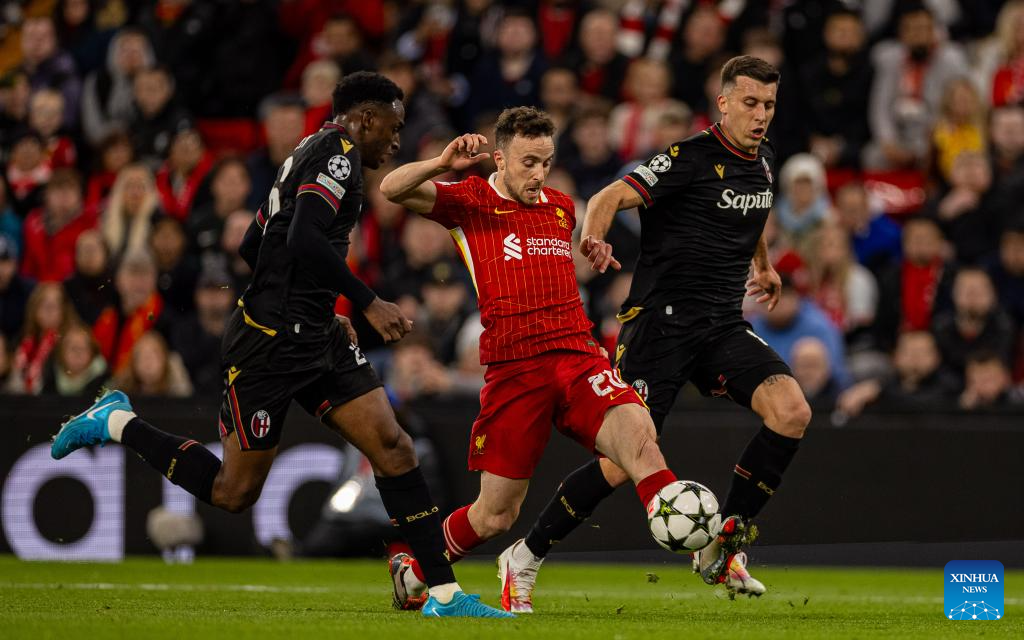 Liverpool's Diogo Jota (C) competes during the second round match of UEFA Champions League between Liverpool FC and Bologna FC in Liverpool, Britain, Oct. 2, 2024. (Xinhua)