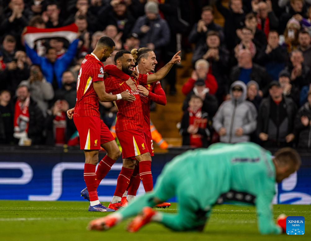 Liverpool's Mohamed Salah (2nd L) celebrates with teammates after scoring during the second round match of UEFA Champions League between Liverpool FC and Bologna FC in Liverpool, Britain, Oct. 2, 2024. (Xinhua)