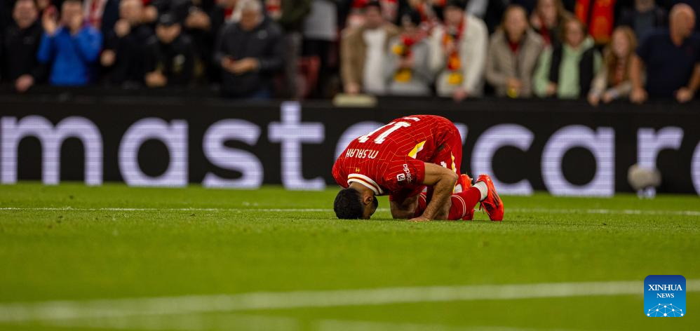 Liverpool's Mohamed Salah celebrates after scoring during the second round match of UEFA Champions League between Liverpool FC and Bologna FC in Liverpool, Britain, Oct. 2, 2024. (Xinhua)