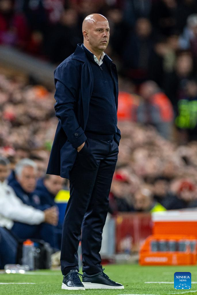 Liverpool's head coach Arne Slot reacts during the second round match of UEFA Champions League between Liverpool FC and Bologna FC in Liverpool, Britain, Oct. 2, 2024. (Xinhua)
