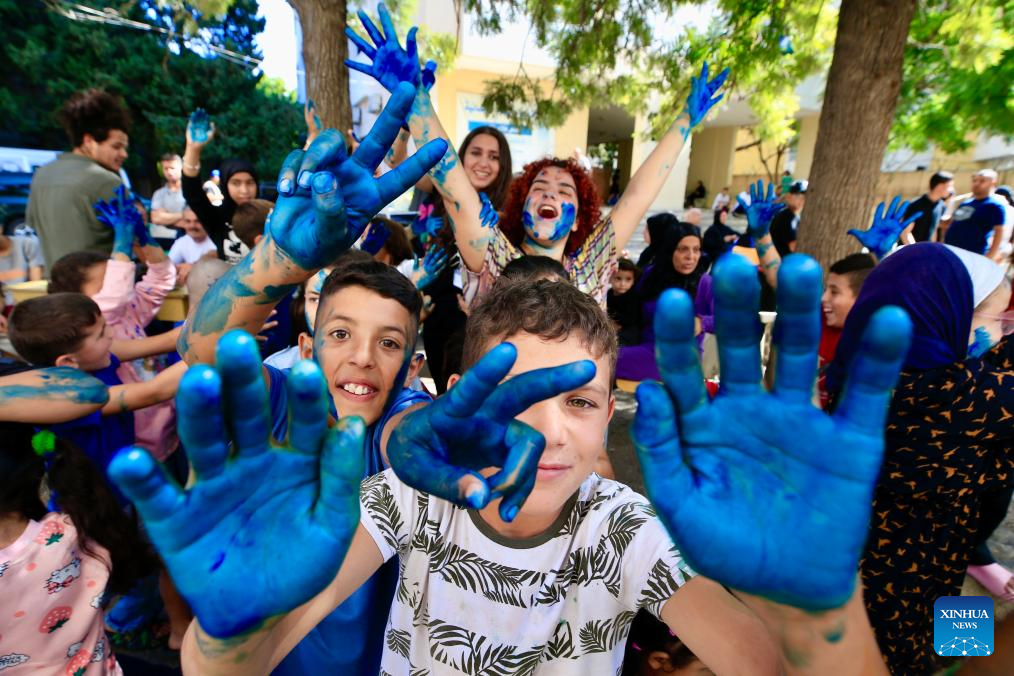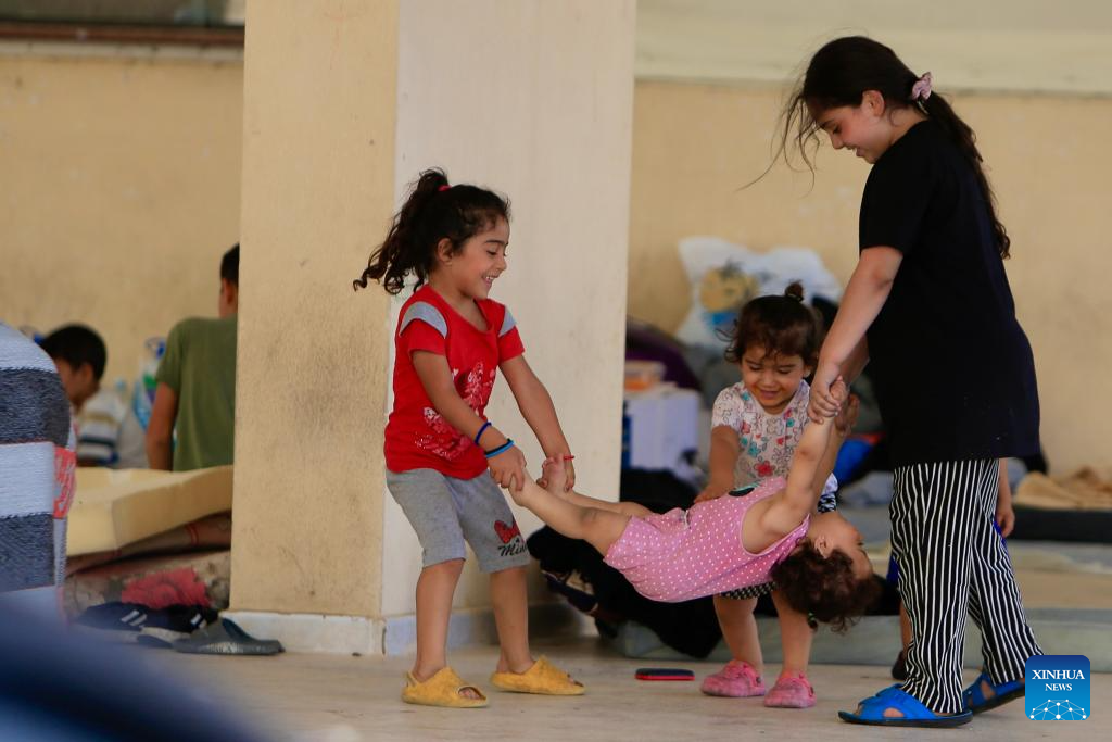 Displaced children play together at a shelter in Sidon, southern Lebanon, on Oct. 2, 2024. The total number of displaced persons in Lebanon due to Israeli airstrikes has risen to nearly 1.2 million, according to a report released on Wednesday by the Disaster Risk Management Unit at the Lebanese Council of Ministers. (Photo by Ali Hashisho/Xinhua)