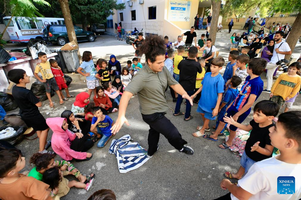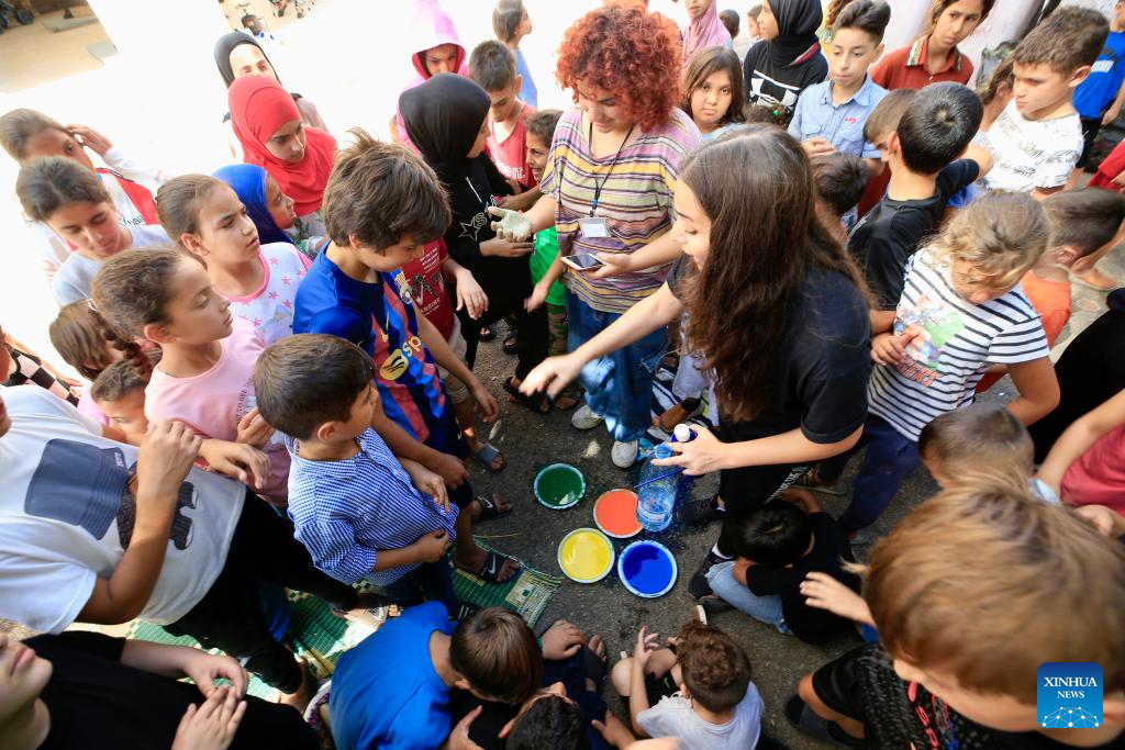 Volunteers accompany displaced children at a shelter in Sidon, southern Lebanon, on Oct. 2, 2024. The total number of displaced persons in Lebanon due to Israeli airstrikes has risen to nearly 1.2 million, according to a report released on Wednesday by the Disaster Risk Management Unit at the Lebanese Council of Ministers. (Photo by Ali Hashisho/Xinhua)