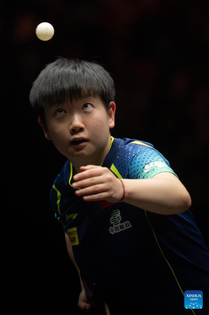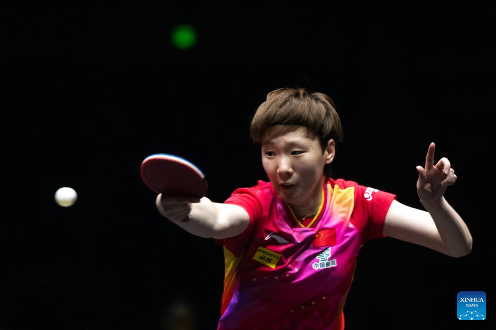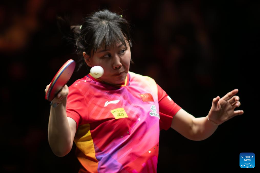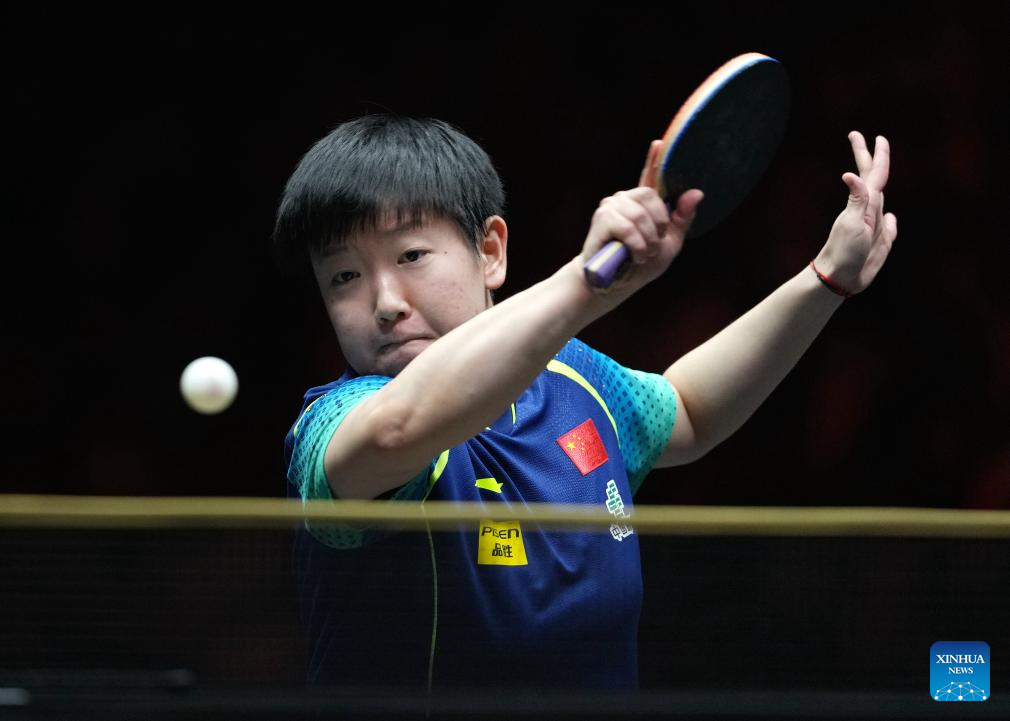 Sun Yingsha hits a return during the women's singles semifinal match between Sun Yingsha of China and Fan Siqi of China at 2024 World Table Tennis (WTT) China Smash in Beijing, China, Oct. 5, 2024. (Xinhua/Zhang Chenlin)