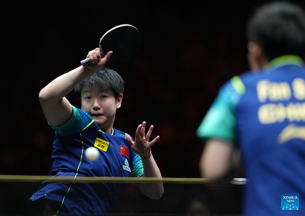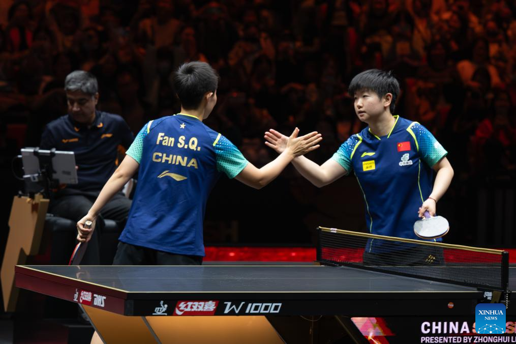 Sun Yingsha (L) hits a return during the women's singles semifinal match between Sun Yingsha of China and Fan Siqi of China at 2024 World Table Tennis (WTT) China Smash in Beijing, China, Oct. 5, 2024. (Xinhua/Zhang Chenlin)