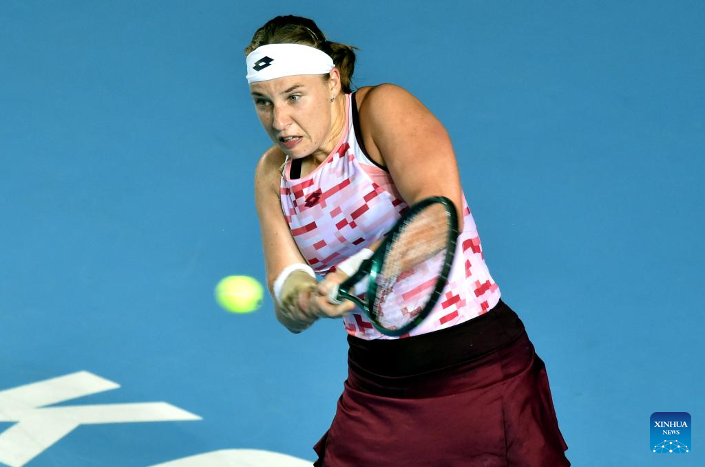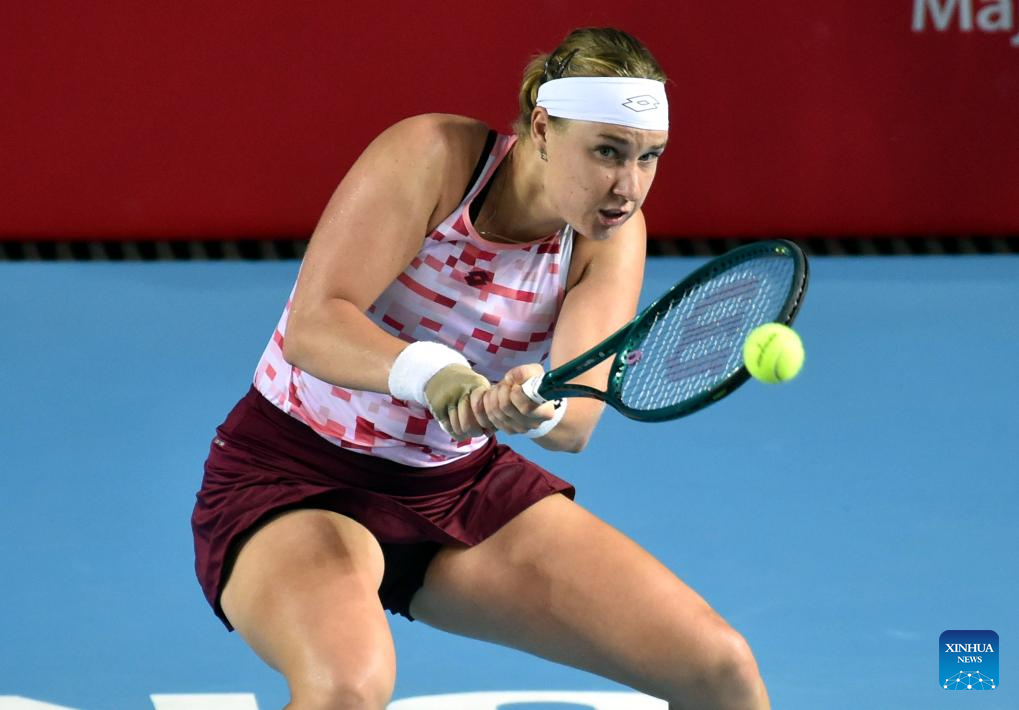 Anna Blinkova hits a return during the women's singles semifinal match between Ajla Tomljanovic of Australia and Anna Blinkova of Russia at WTA Hong Kong 125 Open tennis tournament in Hong Kong, south China, Oct. 5, 2024. (Photo by Lo Ping Fai/Xinhua)