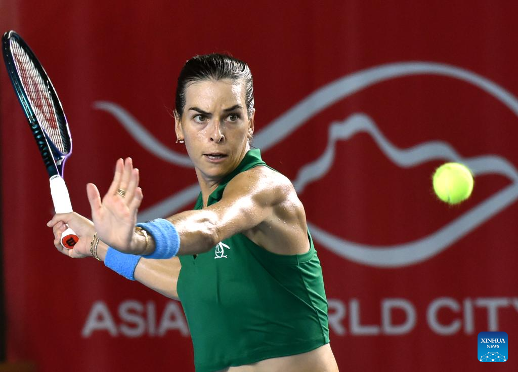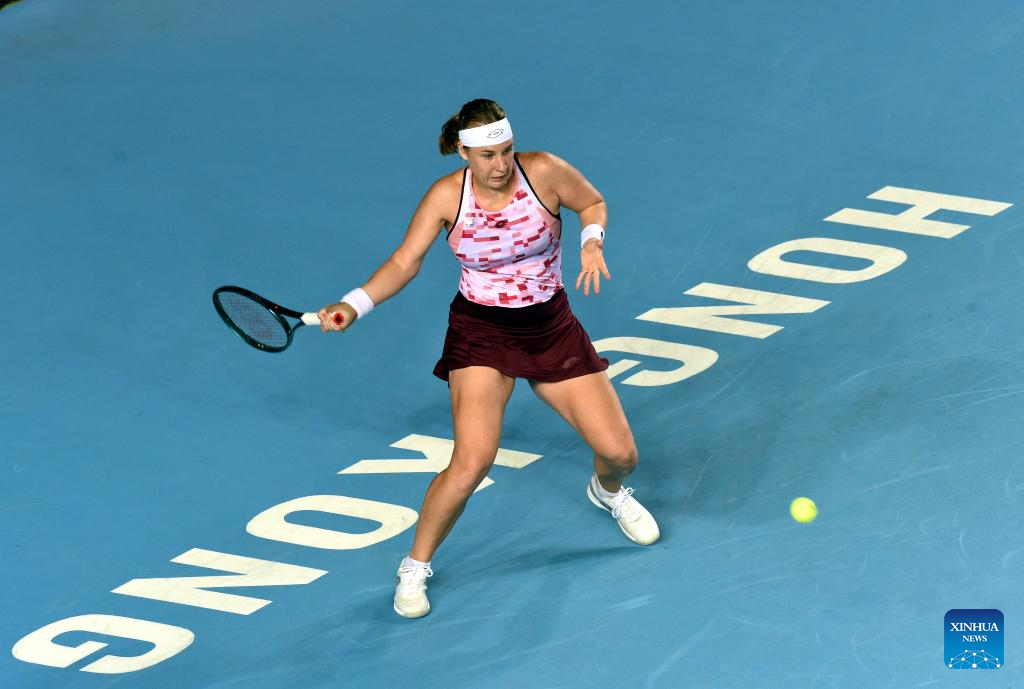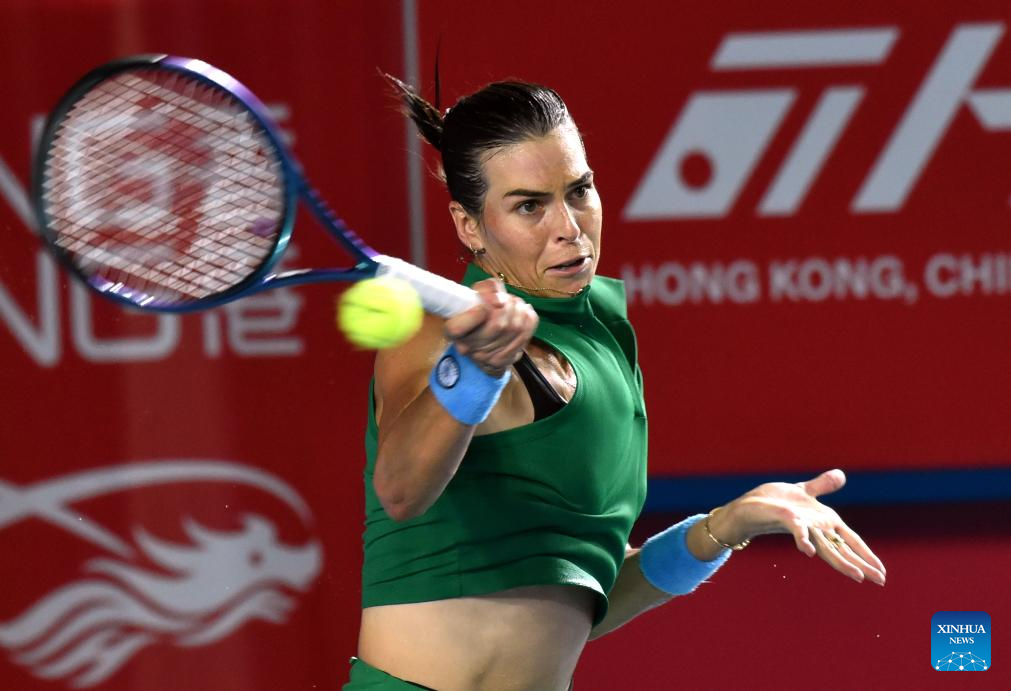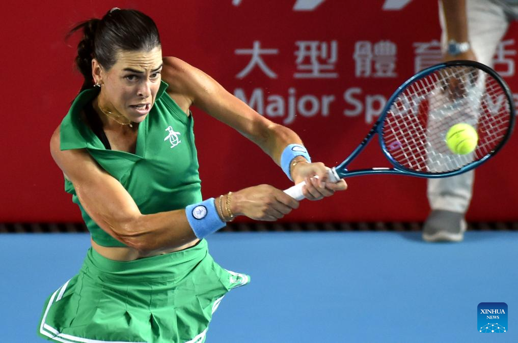 Ajla Tomljanovic hits a return during the women's singles semifinal match between Ajla Tomljanovic of Australia and Anna Blinkova of Russia at WTA Hong Kong 125 Open tennis tournament in Hong Kong, south China, Oct. 5, 2024. (Photo by Lo Ping Fai/Xinhua)