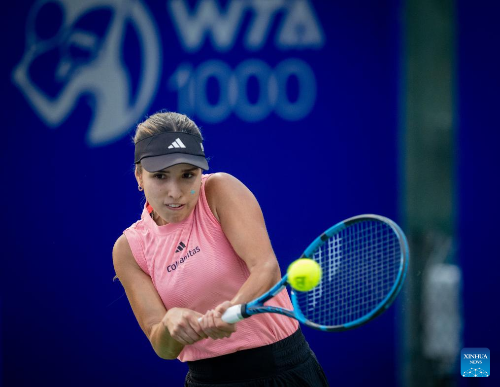 Camila Osorio hits a return during the women's singles qualifying match between Martina Trevisan of Italy and Camila Osorio of Colombia at 2024 Wuhan Open tennis tournament in Wuhan, capital of central China's Hubei Province, Oct. 5, 2024. (Xinhua/Hu Jingwen)