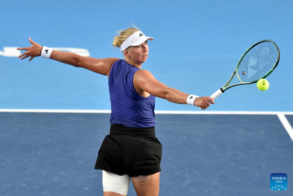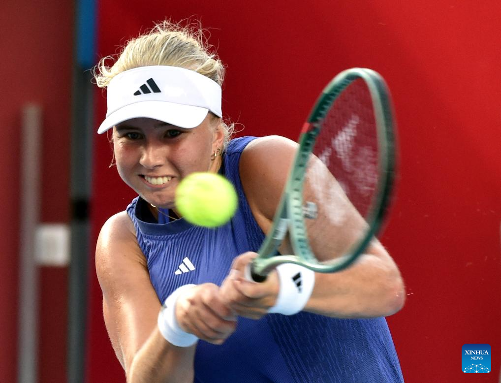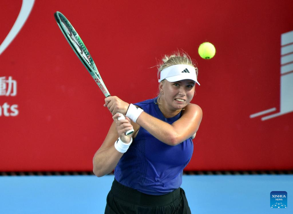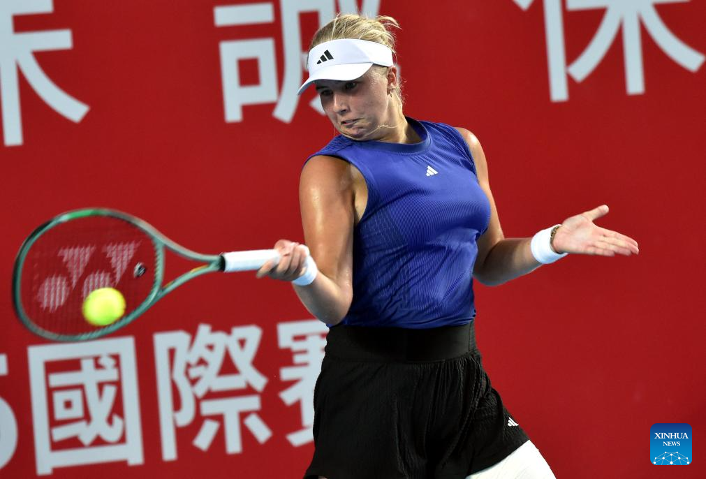 Clara Tauson of Denmark hits a return during the women's singles final match between Ajla Tomljanovic of Australia and Clara Tauson of Denmark at WTA Hong Kong 125 Open tennis tournament in Hong Kong, south China, Oct. 6, 2024. (Photo by Lo Ping Fai/Xinhua)