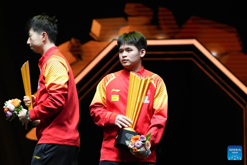 Winner Lin Shidong (R) and runner-up Ma Long of China react during the awarding ceremony for the men's singles event at 2024 World Table Tennis (WTT) China Smash in Beijing, China, Oct. 6, 2024. (Xinhua/Ju Huanzong)