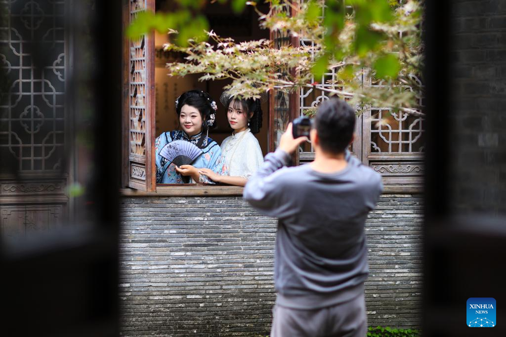 Tourists pose for photos at the Laomendong scenic zone in Nanjing, capital of east China's Jiangsu Province, Oct. 6, 2024. During the week-long National Day holiday starting on Oct. 1, Chinese people take a break to travel and enjoy leisure activities. People's increasing strong demand for diversified vacation options has given rise to more abundant and diverse cultural and tourism products in the tourism market during the holiday. (Photo by Su Yang/Xinhua)