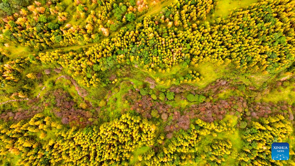 An aerial drone photo taken on Oct. 4, 2024 shows the autumn scenery of Liupanshan in Guyuan City, northwest China's Ningxia Hui Autonomous Region. (Xinhua/Wang Peng)