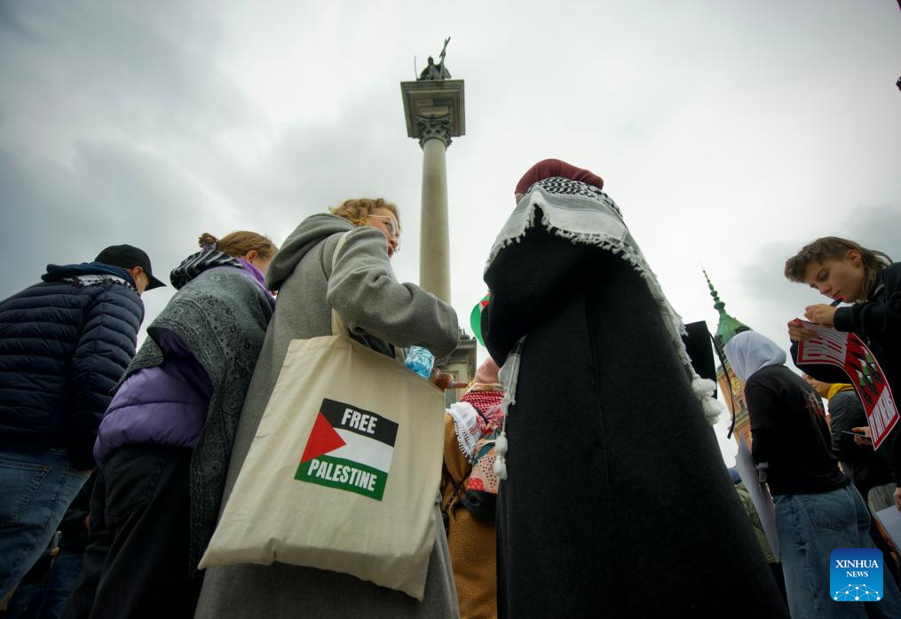 People participate in a rally in support of Palestine near the Castle Square in Warsaw, Poland on Oct. 5, 2024. (Photo by Jaap Arriens/Xinhua)