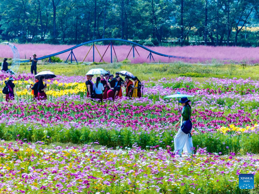 A drone photo taken on Oct. 6, 2024 shows people enjoying themselves at a scenic spot in Xinxi Village of Dong'an County, Yongzhou City, central China's Hunan Province. During the week-long National Day holiday starting on Oct. 1, Chinese people take a break to travel and enjoy leisure activities. People's increasing strong demand for diversified vacation options has given rise to more abundant and diverse cultural and tourism products in the tourism market during the holiday. (Photo by Cai Xiaoping/Xinhua)