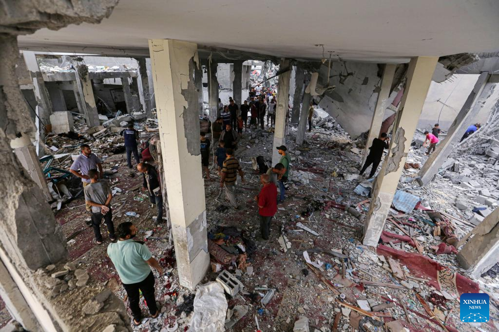 Palestinians check a destroyed mosque after it was attacked by the Israeli army in the city of Deir al-Balah in central Gaza Strip, on Oct. 6, 2024. At least 24 Palestinians were killed and 93 others wounded during Israel's bombing of a mosque and a school in the central Gaza Strip on Sunday, media reports said. (Photo by Rizek Abdeljawad/Xinhua)