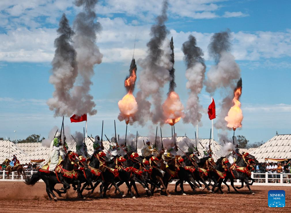 This photo taken on Oct. 5, 2024 shows Tbourida, a Moroccan equestrian performance, at the 15th Horse Show of El Jadida, in El Jadida, Morocco. (Xinhua/Huo Jing)