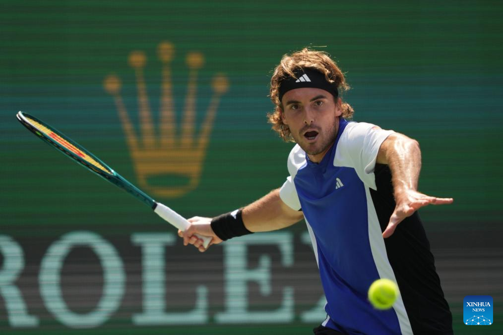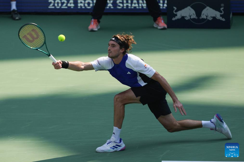 Stefanos Tsitsipas hits a return during the men's singles round of 32 match between Stefanos Tsitsipas of Greece and Alexandre Muller of France at the ATP World Tour Shanghai Masters tennis tournament in Shanghai, east China, Oct. 8, 2024. (Xinhua/Xu Yanan)